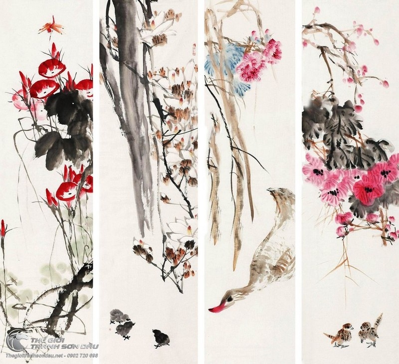 Tranh Bộ Tứ Quý Mẫu Đơn Mai Đào Chim Hạc
