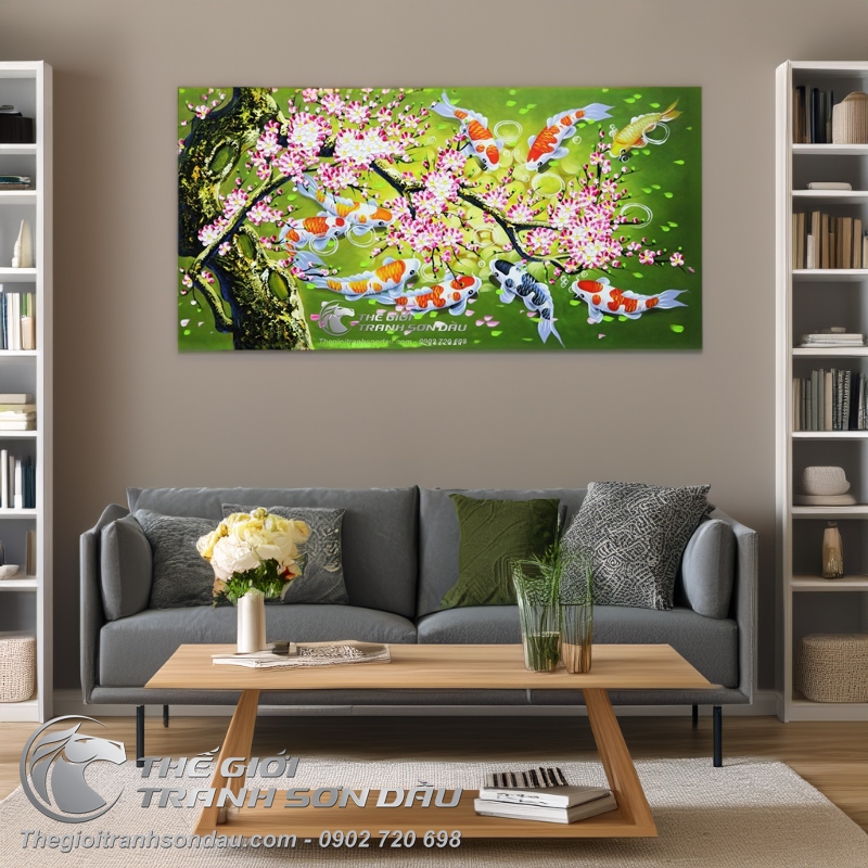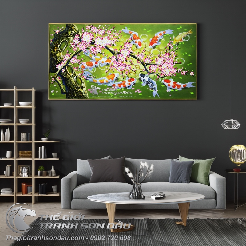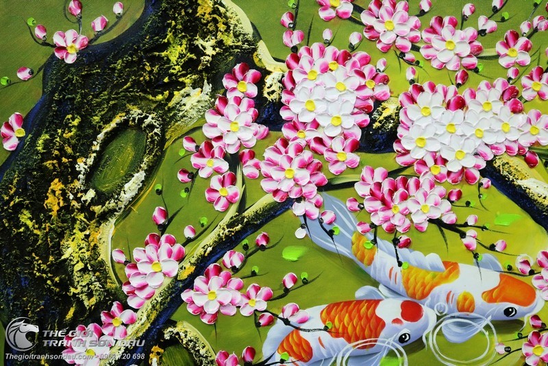 - Hoa đào như gieo vào lòng người niềm tin, hi vọng về những điều tốt đẹp trong tương lai, đem đến nguồn sinh khí mới, mọi người trong gia đình đều dồi dào sức khỏe, vạn sự như ý. Đặc biệt, điểm chấm phá khác lạ trong bức họa này là dưới bóng đào khoe sắc, một đàn cá chép Koi nhiều màu sắc đang bơi lội tung tăng. Cá chép Koi được biết đến là một loại cá có sức sống mãnh liệt, lâu dài và cũng được coi là một loài cá quý.