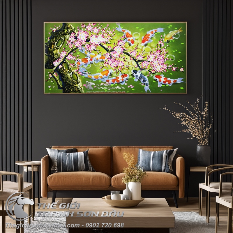 - Chính vì thế mà nó là một biểu tượng cho sự trường tồn, sức mạnh, ước vọng, lòng kiên trì và cả may mắn. Cùng với đó, 9 con cá chép còn có ý nghĩa là hữu bật phúc tinh, cũng là sao cát nên 9 con có ý nghĩa vượng tài, mang tài lộc về nhà. Ở đây, người họa sĩ còn tinh tế trong việc sử dụng màu sắc cho cá chép Koi: màu trắng với những đốm đỏ tượng trưng cho sự thành công trong sự nghiệp, màu vàng tượng trưng cho sự giàu có, màu đen và màu trắng đại diện cho sự hòa hợp của hai nguồn năng lượng âm dương tạo ra một sự cân bằng và hài hòa.