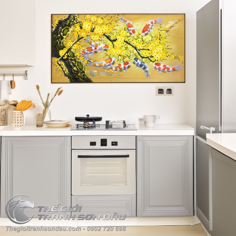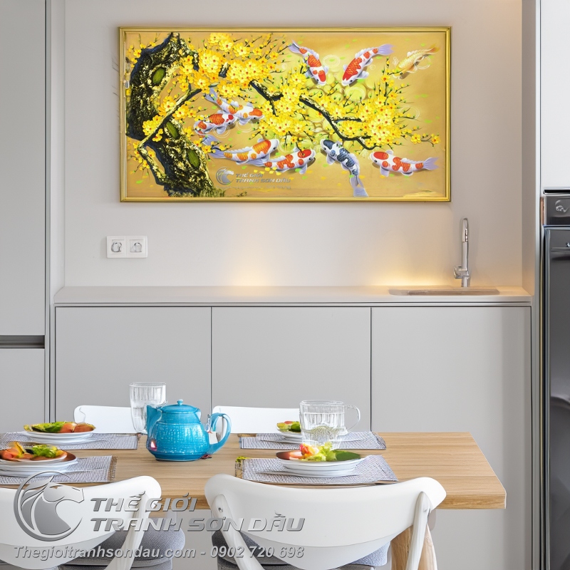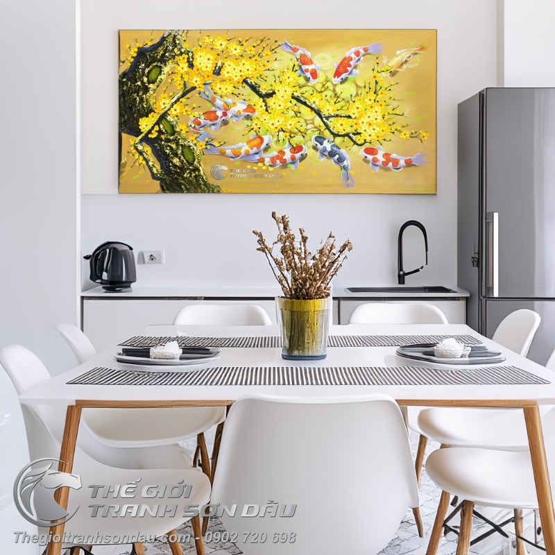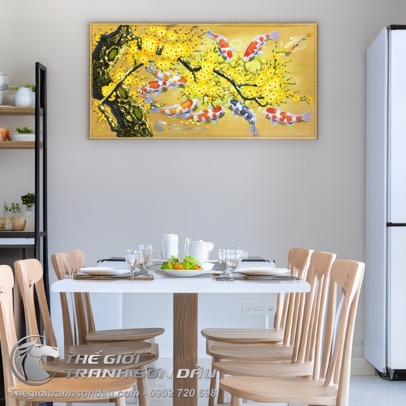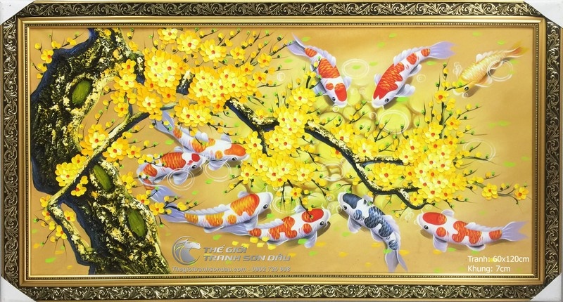 Tranh Sơn Dầu Vẽ Chín Con Cá Chép Dưới Gốc Mai Vàng