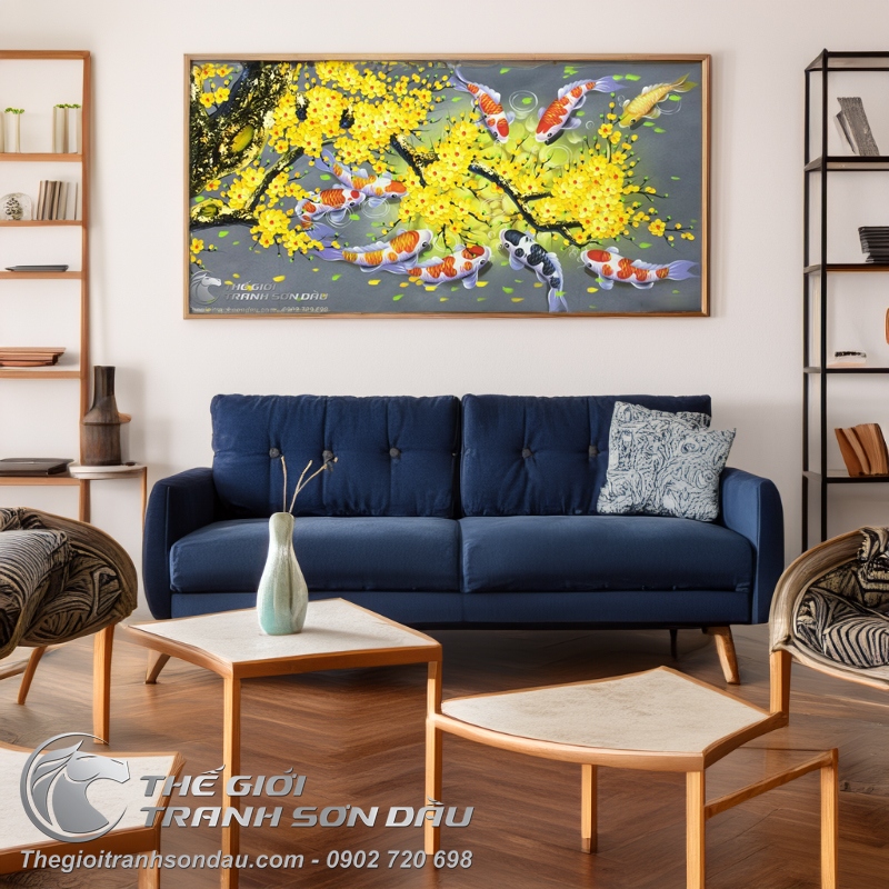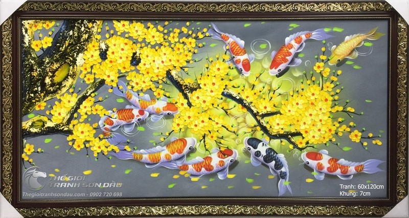 Tranh Sơn Dầu Vẽ Chín Con Cá Chép Dưới Gốc Mai Vàng