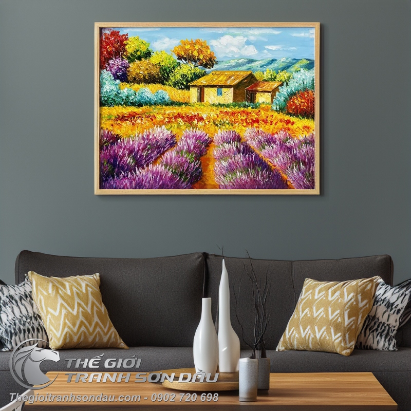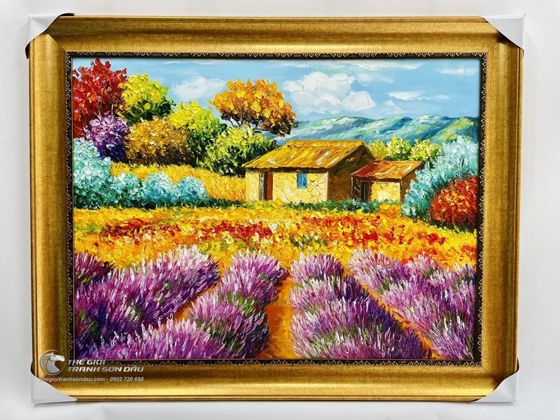 - Tranh vẽ cảnh thiên nhiên ngôi nhà sơn quê lấy cảm hứng của miền quê nước Pháp. Nơi cuộc sống bình dị trôi qua trong cảnh sắc mùa thu rực rỡ dưới ánh chiều hoàng hôn. Bức tranh mở rộng trước mắt người xem khung cảnh thiên nhiên tuyệt đẹp, với những gam màu nổi bật sắc nét. Có tác dụng và thu hút người xem, thích hợp để trang trí trong phòng khách gia đình, khách sạn.