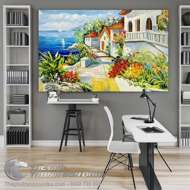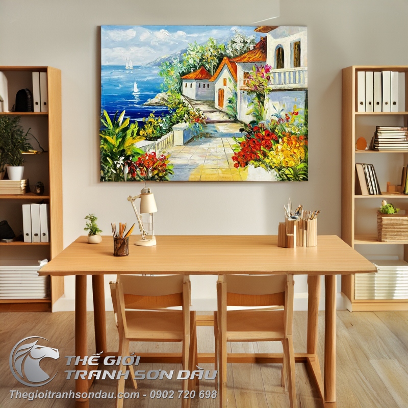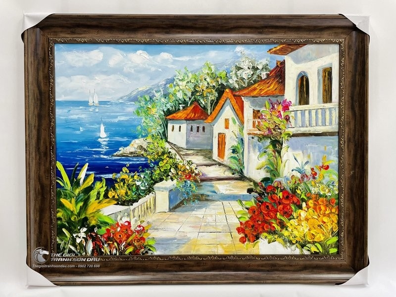 - Tranh vẽ phong cảnh treo tường góc phố châu Âu bên bờ biển tái hiện khung cảnh bờ biển Địa Trung Hải trong những ánh nắng vàng rực rỡ của ngày thu sang. Với nhịp sống bình yên của thành phố ven biển, khung cảnh thiên nhiên tuyệt đẹp với biển cả bao la, những bông hoa đầy sắc màu tươi tắn bên hiên nhà. Tạo nên một không gian tuyệt đẹp có sức hấp dẫn mạnh mẽ với người xem.