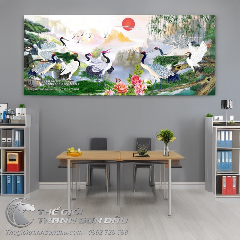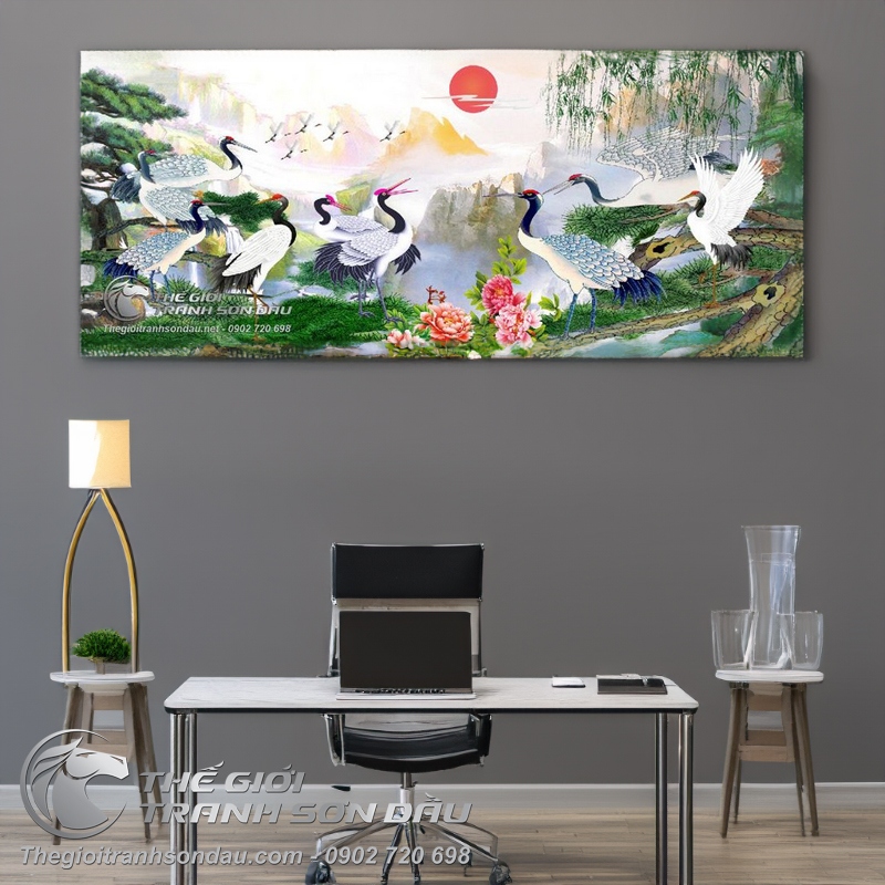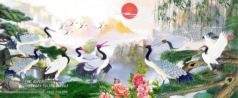 Tranh Chim Hạc Liễu Rũ Mặt Trời Đỏ