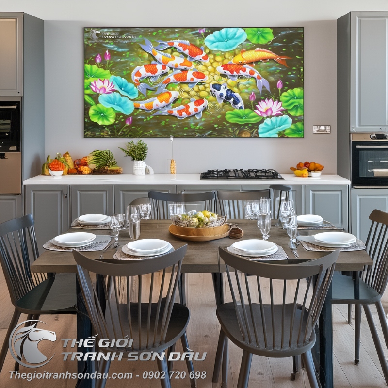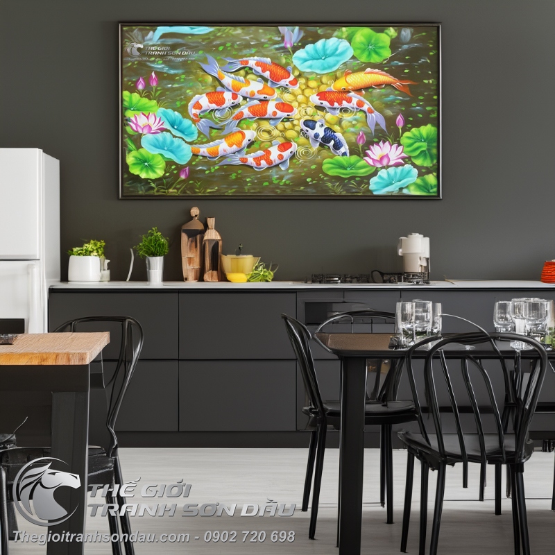 - Trong văn hóa phương Đông số 9 tượng trưng cho sự lớn nhất, hoàn hảo, hoàn mỹ nhất giống như "cửu đỉnh", "cửu trùng"... Bức tranh sử dụng hình ảnh 9 con cá chép tượng trưng cho sự đủ đầy trong cuộc sống, trọn vẹn trong công việc, là biểu tượng của nhân sinh quan của văn hóa phương Đông.