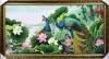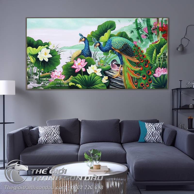 - Bức tranh uyên ương đôi chim công với vẻ đẹp vô cùng sặc sỡ một mái một trống cùng với hình ảnh của chim công non được đặt được đặt trong một khung cảnh sông nước núi rừng rộng lớn và hùng vỹ lại càng tôn lên vẻ đẹp của loài chim khổng tước, loài chim được mệnh danh là đẹp nhất trong các loài chim bởi nó là sự hiện thân cho cái đẹp, của cải, sự xa hoa phú quý, và vương giả.
