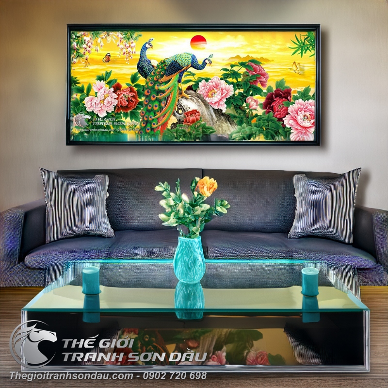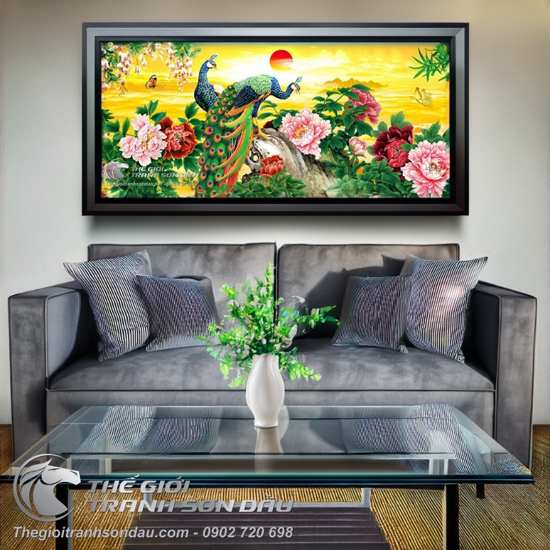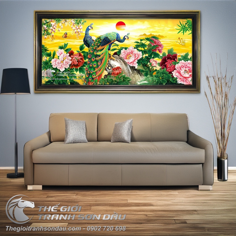Tranh Đôi Chim Công Bên Hoa Mẫu Đơn Và Mặt Trời Đỏ