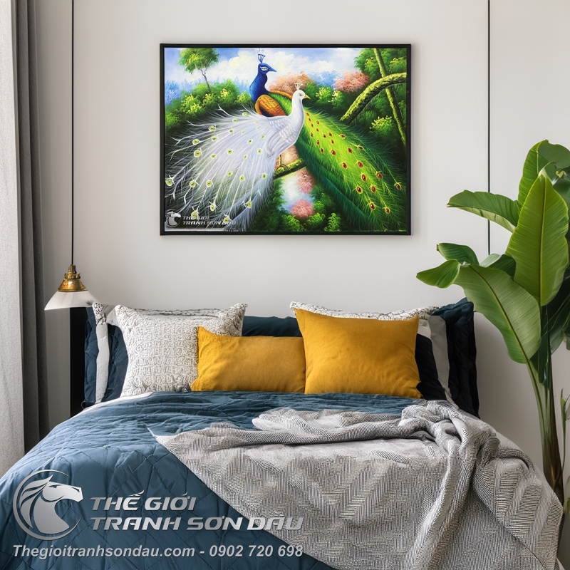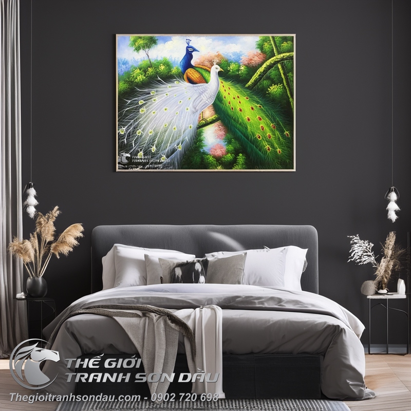Tranh Đôi Chim Công Uyên Ương Vẽ Bằng Màu Sơn Dầu Đẹp