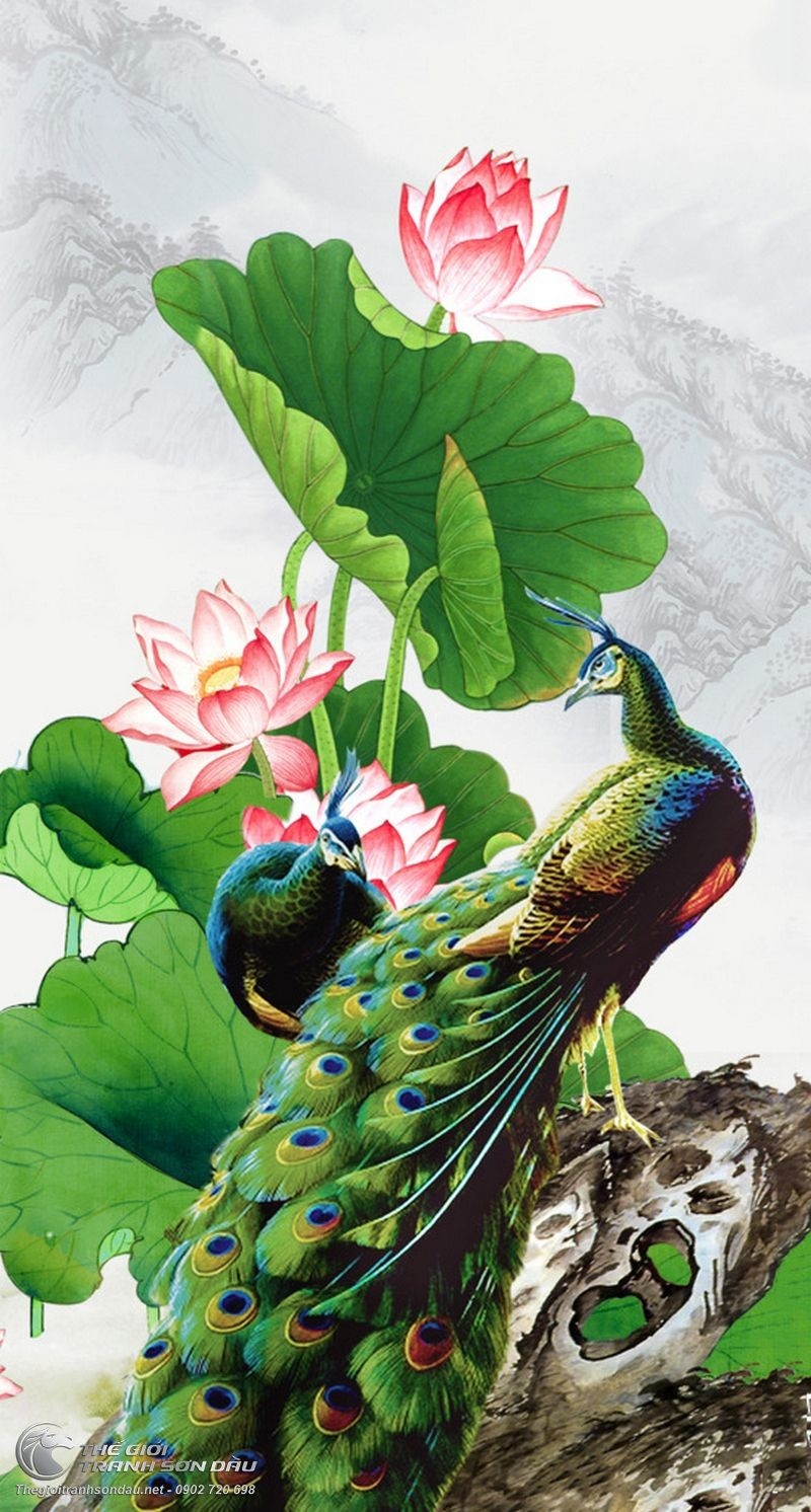 Tranh Đôi Chim Công Bên Hồ Hoa Sen