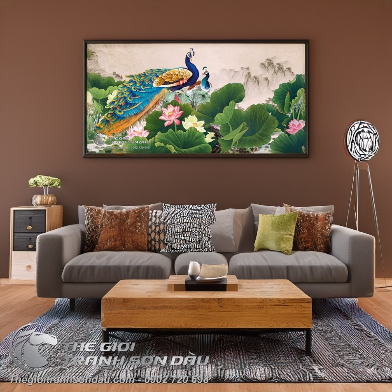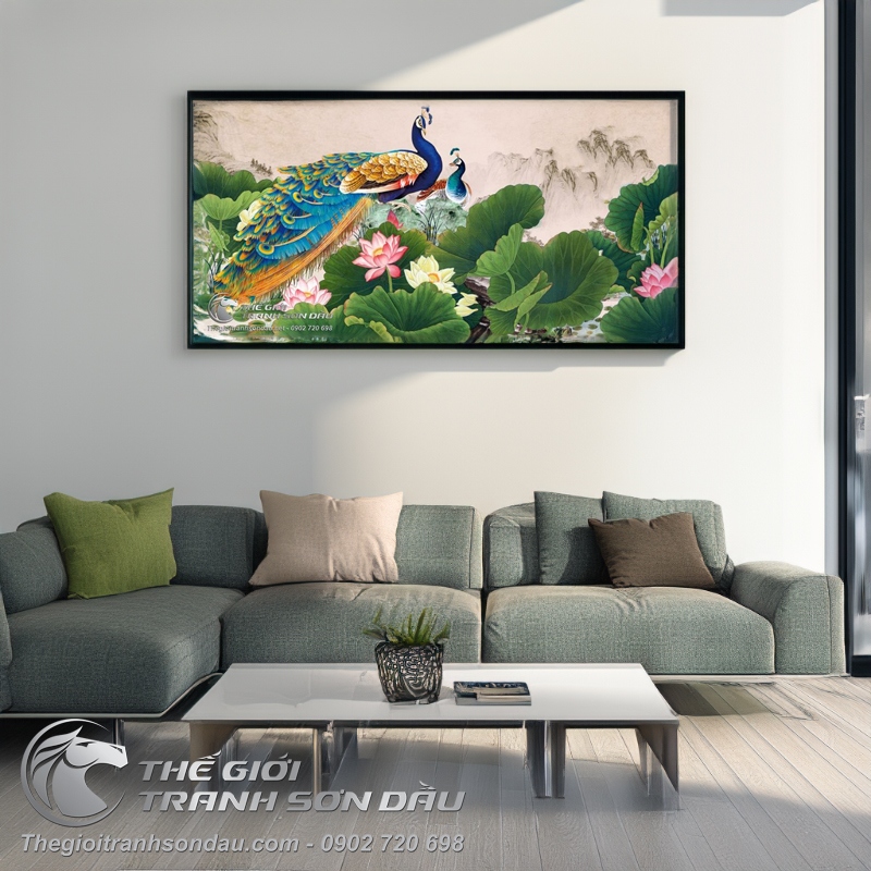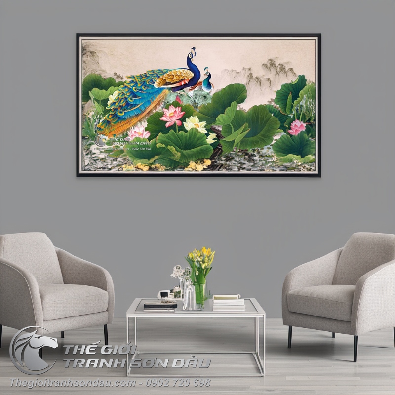 Tranh Đôi Chim Công Bên Hồ Hoa Sen
