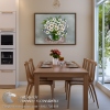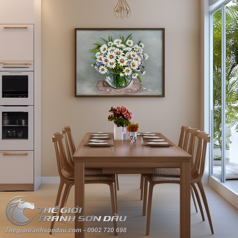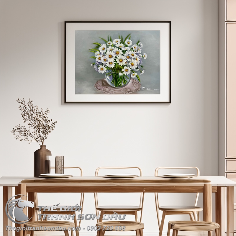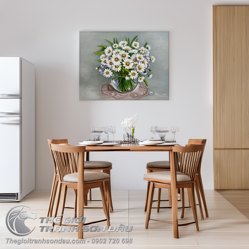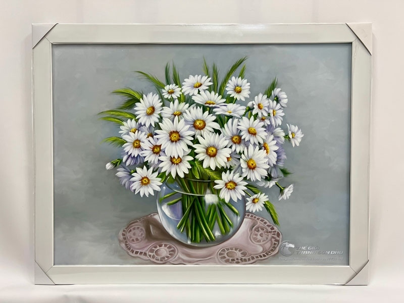 - Tranh sơn dầu hoa cúc trắng được vẽ theo phong cách tả thực với những bông hoa chân thực được vẽ tỉ mỉ từng đường nét. Từng cánh hoa rộng nở tạo nên một hình dáng tròn trịa và tươi sáng. Nhụy hoa màu vàng sáng nét, mang tới sự tươi mới và năng động cho bức tranh. Những nhụy hoa được chấm thành từng nét để tạo hình dạng & cấu trúc y hệ như bông hoa đời thực.
