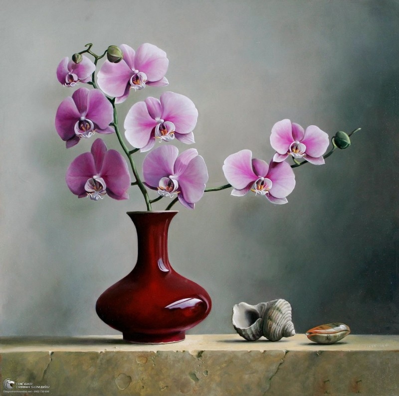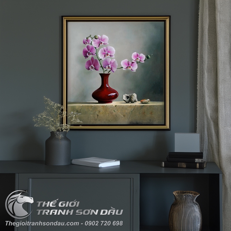Tranh Bình Chứa Hoa Lan Và Vỏ Sò
