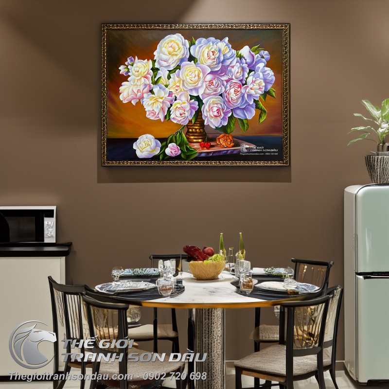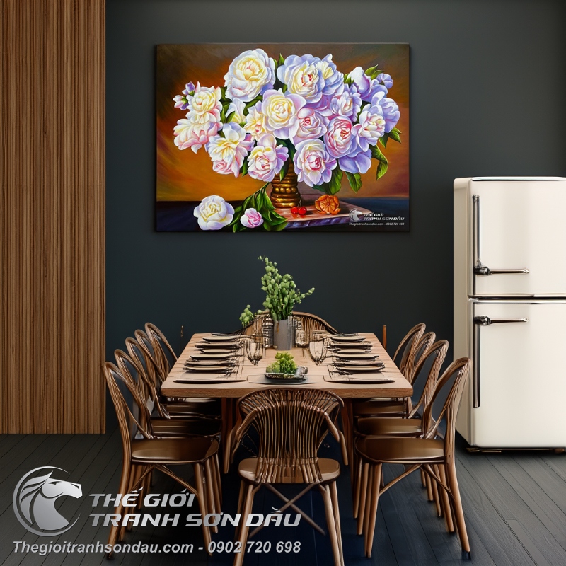 - Trong phong thủy, hoa mẫu đơn tím chính là biểu tượng của sự giàu sang, mang lại niềm vui sự may mắn và thành công cho gia chủ. Còn với những bông mẫu đơn hồng lại mang trong mình sự nhẹ nhàng, trang nhã, tượng trưng sự yêu thương và trân trọng.Tranh sơn dầu vẽ hoa mẫu đơn phù hợp để treo trong phòng khách, phòng ngủ, phòng làm việc hay làm quà tặng tân gia, khai trương cho người thân bạn bè không chỉ là một món quà trang trí đầy sự sang trọng mà nó còn thay cho lời chúc: “Thịnh vượng, phú quý, hạnh phúc và bình an”.