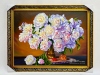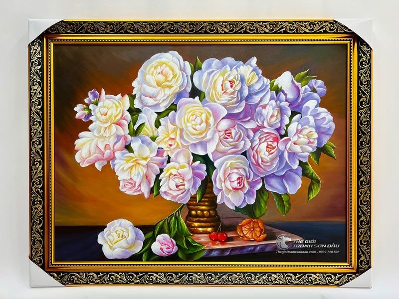 - Bằng những nét vẽ vô cùng mềm mại cùng sự kết hợp màu sắc tinh tế, khéo léo tạo ra những mảng tối của nền cùng sự đổ bóng của hướng sáng để làm nổi bật lên hình ảnh lọ hoa mẫu đơn vô cùng chân thực, sống động và hài hòa. Lọ hoa hiện lên mang hơi hướng cổ điển, sang trọng và quyền quý, đắt tiền với từng chi tiết cánh hoa mềm mại, thật như có thể vuốt ve nó. Những bông hoa nở rộ khoe sắc và cũng có cả những nụ hoa còn đang e ấp, ngượng ngùng như người con gái tuổi mới lớn.