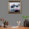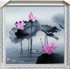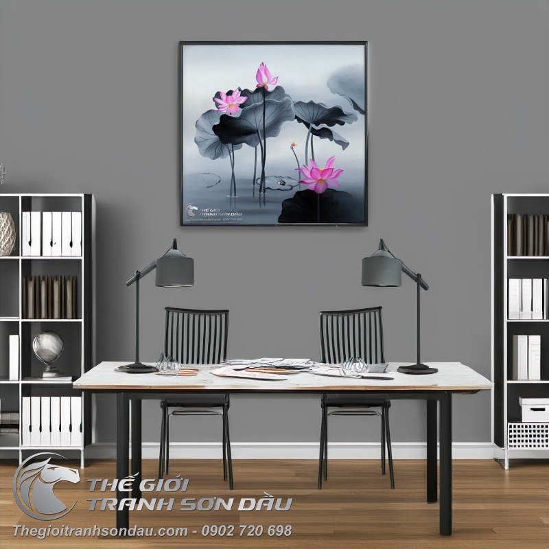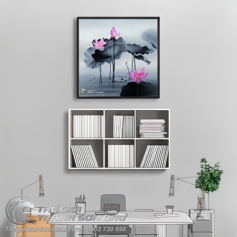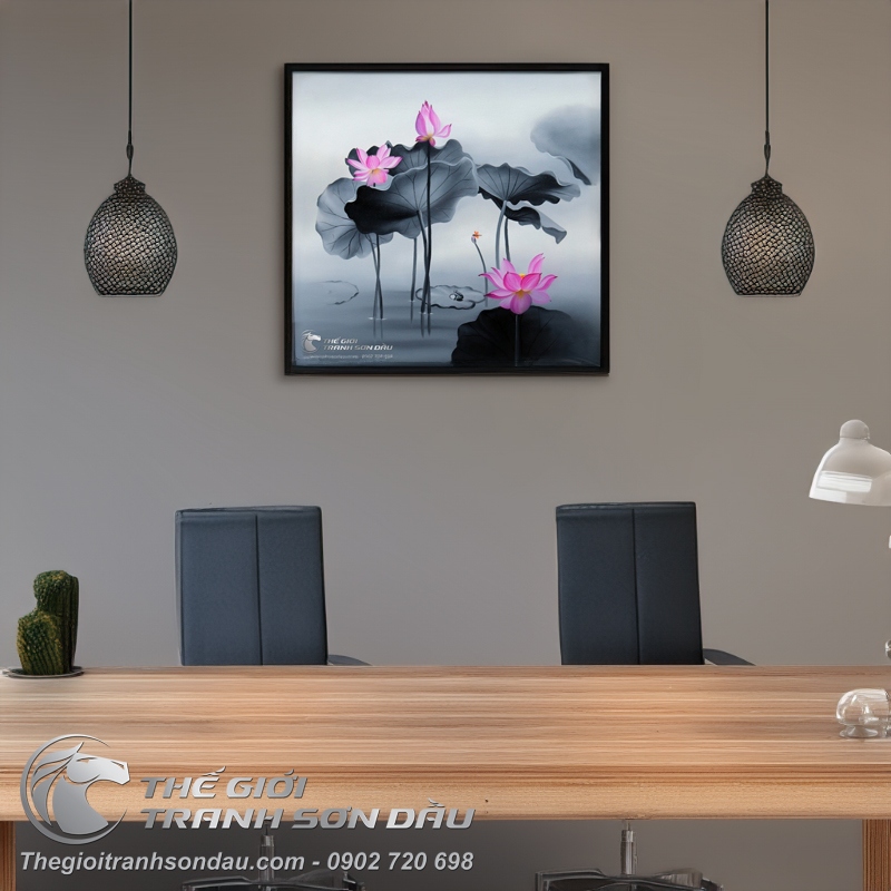 - Hình ảnh những bông hoa sen màu hồng trên nền xám mờ nhạt làm nổi bật vẻ đẹp tuyệt vời của những cánh hoa sen. Sự phối màu khéo léo góp phần giúp những bông hoa nở rộ gây ấn tượng mạnh mẽ hơn với người xem tranh.