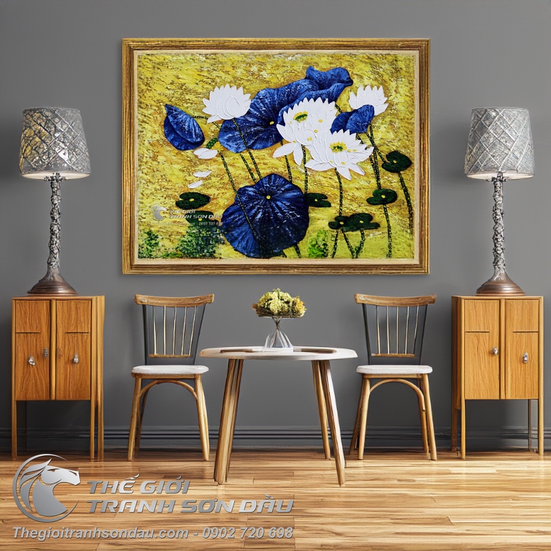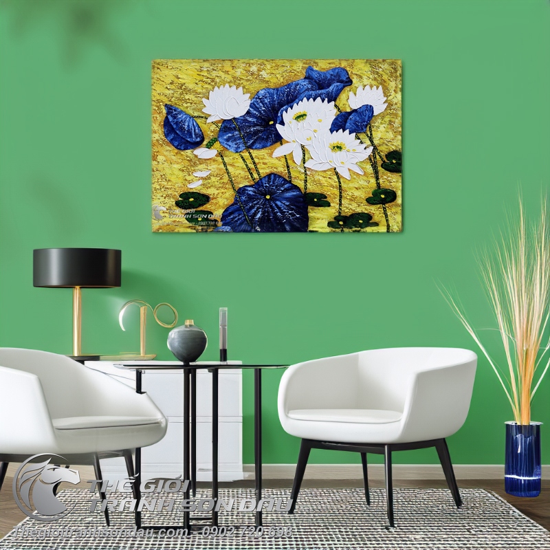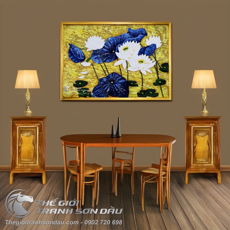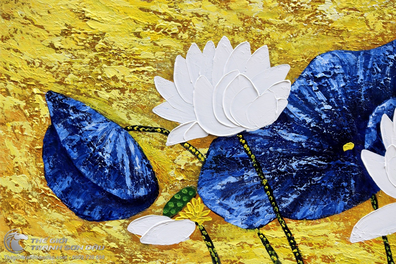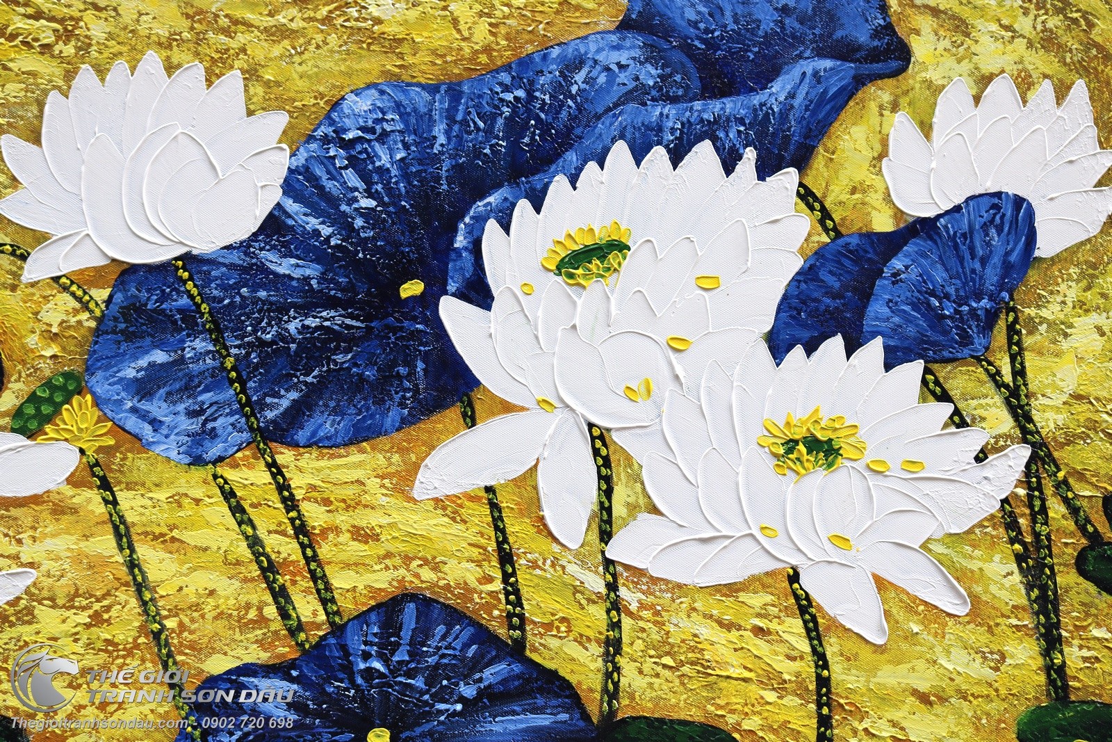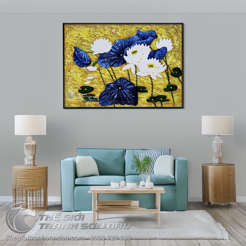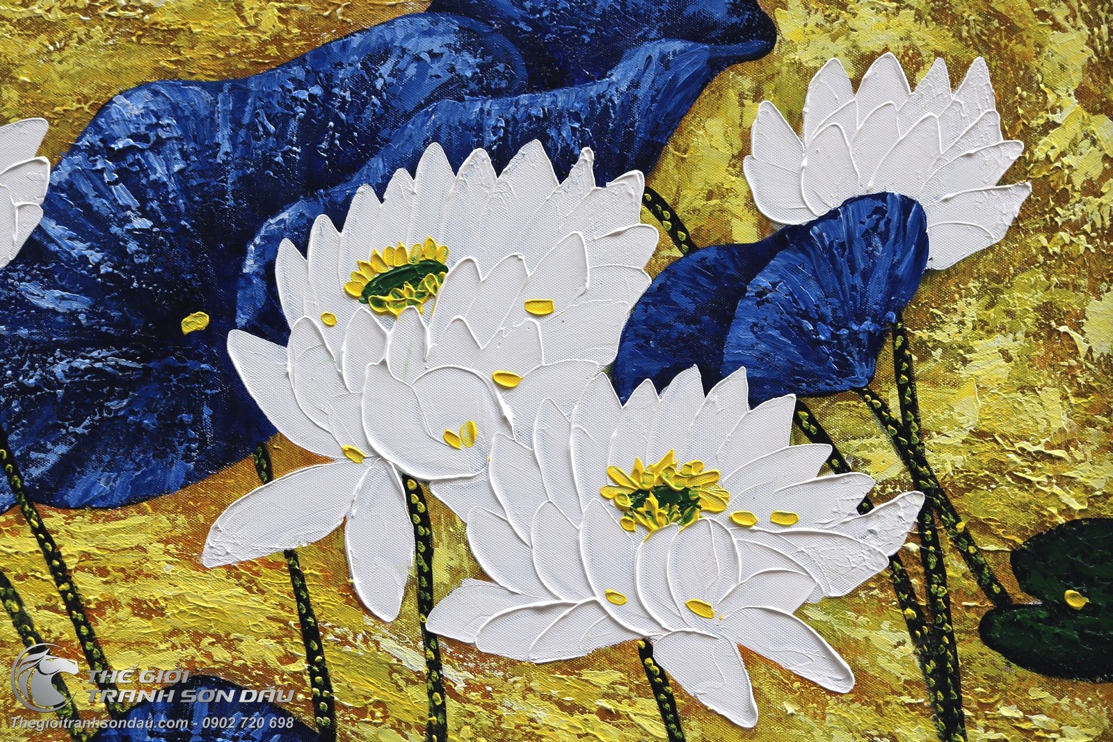 - Bức tranh hoa sen trắng không chỉ được ưa chuộng bởi vẻ đẹp đầy tính nghệ thuật mà nó còn mang trong mình ý nghĩa phong thủy cực tốt lành cho gia chủ khi treo trong nhà, giúp điều hòa vượng khí, tăng cường năng lượng tốt như về sức khỏe, tinh thần, giúp gia chủ gỡ bỏ mọi ưu phiền, để tĩnh tâm, an hưởng hạnh phúc. Tranh còn mang ý nghĩa của sự no đủ, giàu có và phồn vinh. Tranh treo tường sơn dầu vẽ hoa sen lí tưởng để có thể treo phòng khách hay phòng làm việc giúp tâm hồn trở lên nhẹ nhàng thư thả hơn và mang đến căn phòng một màu sắc tươi tắn của sắc hoa nở rộ.