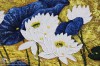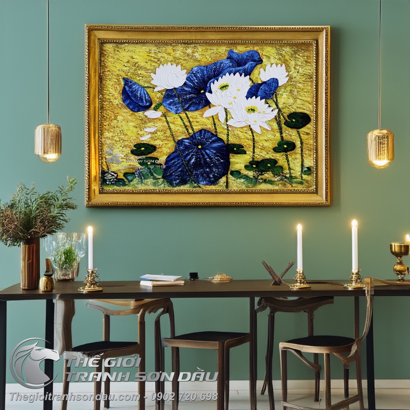 - Trong Phật giáo hoa sen là sự biểu tượng của nhân quả luân hồi: trong đó hoa nở tượng trưng cho quá khứ, đài sen tượng trưng cho hiện tại và hạt sen tượng trưng cho tương lai, sự nối tiếp liên tục và thịnh vượng. Các lá sen được vẽ nên thông qua sự pha trộn giữa các màu sắc một cách độc đáo xanh biếc như màu của bầu trời thu xen kẽ liên kết mang đến ý nghĩa là sự đoàn kết thân thiết khó mà tách rời giữa các thành viên trong gia đình, biểu tượng của sự sinh sôi nhiều con cháu. Đặc biệt là màu nền của bức tranh một màu vàng kim màu sắc đặc trưng của tiền tài và tạo ra một cảm giác sang trọng và phú quý.