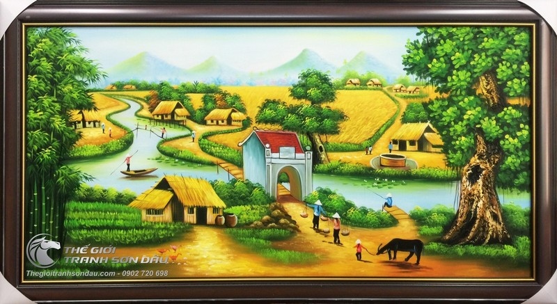 - Bức tranh vẽ phong cảnh đã tái hiện lại một khung cảnh làng quê Việt Nam điển hình với những hình ảnh quen thuộc như cây đa, cổng làng, con sông xanh mát, lũy tre làng, cánh đồng lúa chín hay lác đác là những ngôi nhà mái rơm vàng óng,...