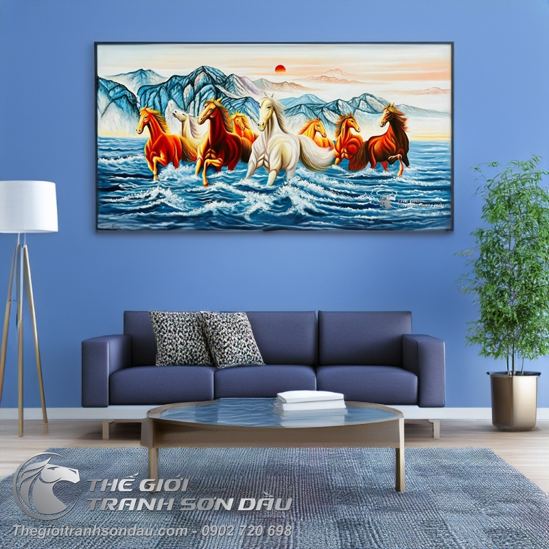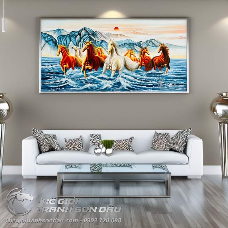 - Màu sắc trong bức tranh sơn dầu mã đáo này sử dụng các gam màu xanh và trắng làm nền với các cơn sóng đầu bạc, những ngọn núi ẩn hiện trong sương mờ. Hình ảnh đàn ngựa & mặt trời màu nâu đỏ hiện lên đầy rực rỡ và sống động làm điểm nhấn thu hút toàn bộ ánh nhìn của người xem. Mang lại hiệu ứng thị giác cực tốt khi trang trí và phân biệt.