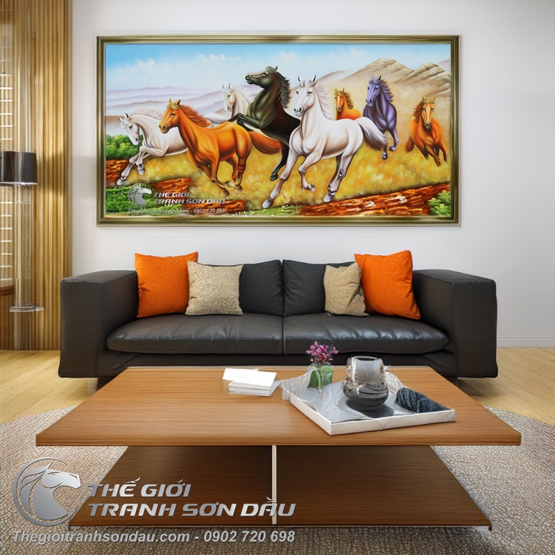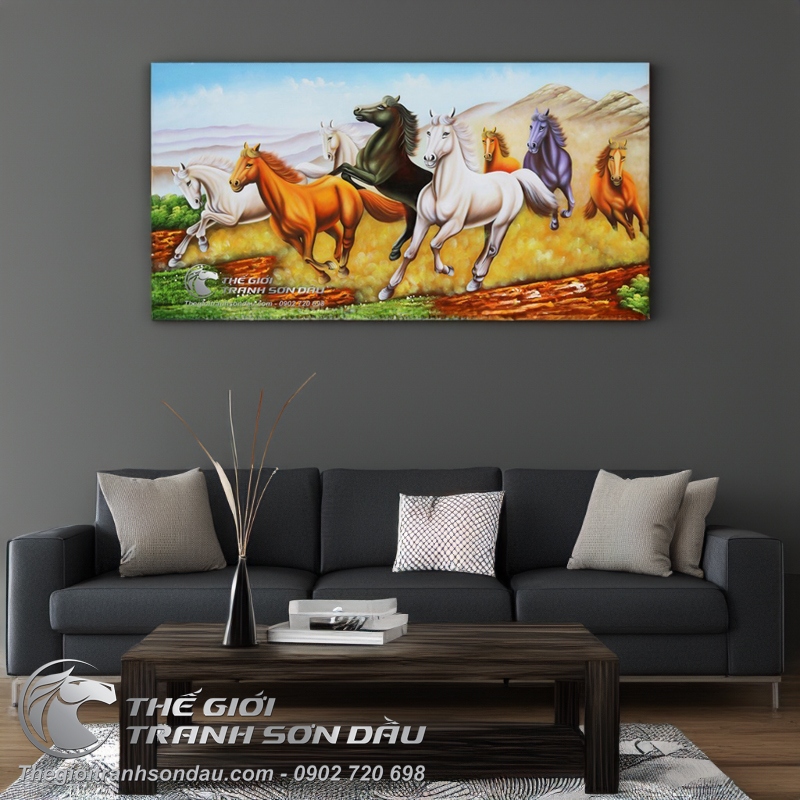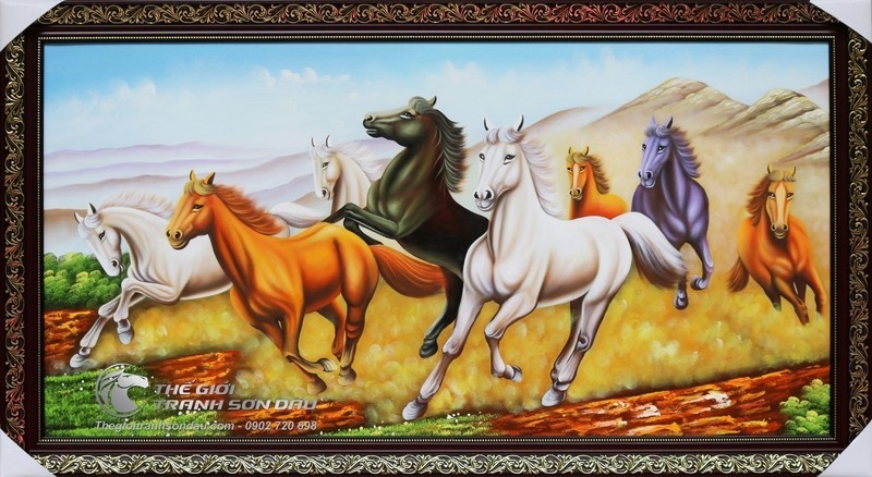 - Hình ảnh tám con ngựa chạy trên đồng cỏ thảo nguyên có ý nghĩa mang lại tài lộc, danh vọng, sự may mắn bởi trong phong thủy, ngựa thuộc mệnh hỏa, đồng cỏ thuộc mệnh mộc, mà hỏa lại sinh mộc nên chắc chắn sẽ mang lại những điều tốt đẹp cho gia đình. Tranh phù hợp để treo ở phòng khách, phòng ăn, phòng làm việc,.. hoặc để biếu hay tặng trong những dịp quan trọng.