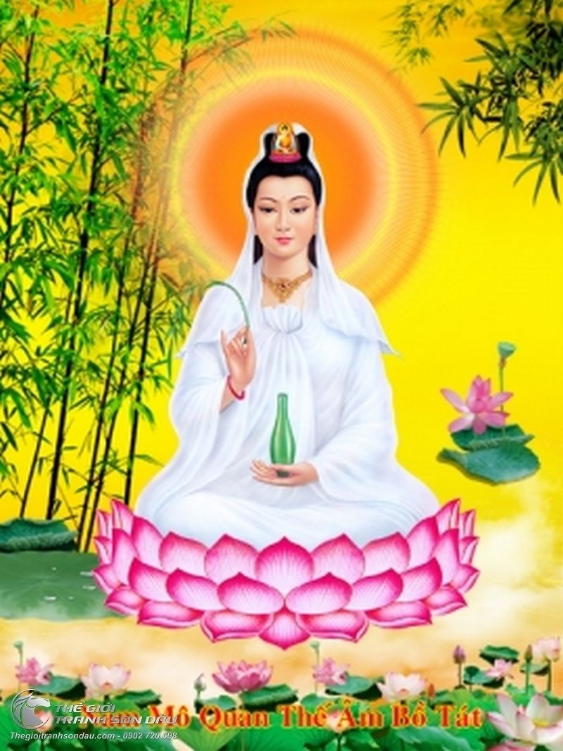 Tranh Phật Quan Âm Ngồi Nền Vàng Vẽ Sơn Dầu