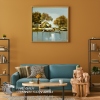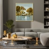 - Bức tranh vẽ quê hương bến vắng trong buổi chiều tà tái hiện khung cảnh làng quê hoang sơ và êm đềm trong buổi chiều tà, dưới ánh nắng mặt trời đã dần tắt, tạo nên không gian tĩnh lặng và dịu dàng. Bến vắng xuất hiện với hình ảnh thanh bình và trầm mặc bên những hàng cây rậm rạp đứng đan xen với nhau, tạo nên bóng mát dịu nhẹ, khiến cho không gian trở nên ấm áp và thư thái.