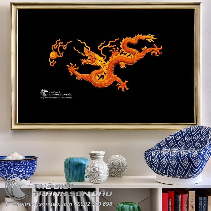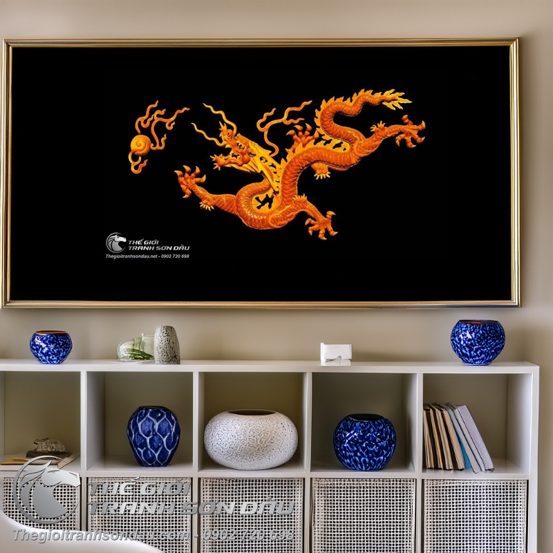 Tranh Rồng Vàng Nhả Châu Trên Nền Đen