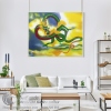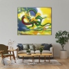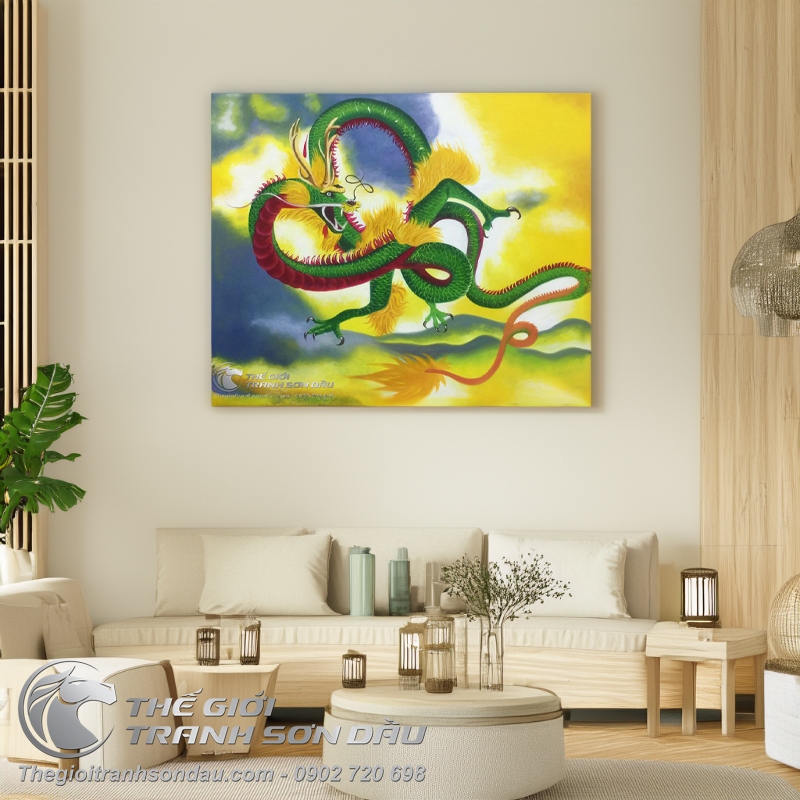 - Từ xưa tới nay rồng luôn là linh vật thần thoại, đứng đầu bộ “Tứ linh” (Long – Lân – Qui – Phụng); tượng trưng cho quyền uy, cho năng lượng của đất trời. Chính vì thế mà tượng rồng hay tranh rồng là những món đồ phong thủy rất phổ biến trong gia đình và văn phòng công ty. Tranh Rồng Xanh Thanh Long khắc họa một thần rồng đang bay lượn trên những đỉnh núi, cuộn mình trong làn mây vàng khói, uy nghi gào thét như đang hô mưa gọi gió. Mình rồng dài uốn lượn, thân màu xanh lục có nhiều vảy, bụng đỏ thẫm, đầu có sừng to như sừng hươu, chân có móng vuốt, lưng có vảy đỏ và những chùm lông vàng, đặc biệt là ánh mắt sắc bén, lạnh lùng,... tất cả đó đều toát lên vẻ uy quyền, oai phong và lẫm liệt.