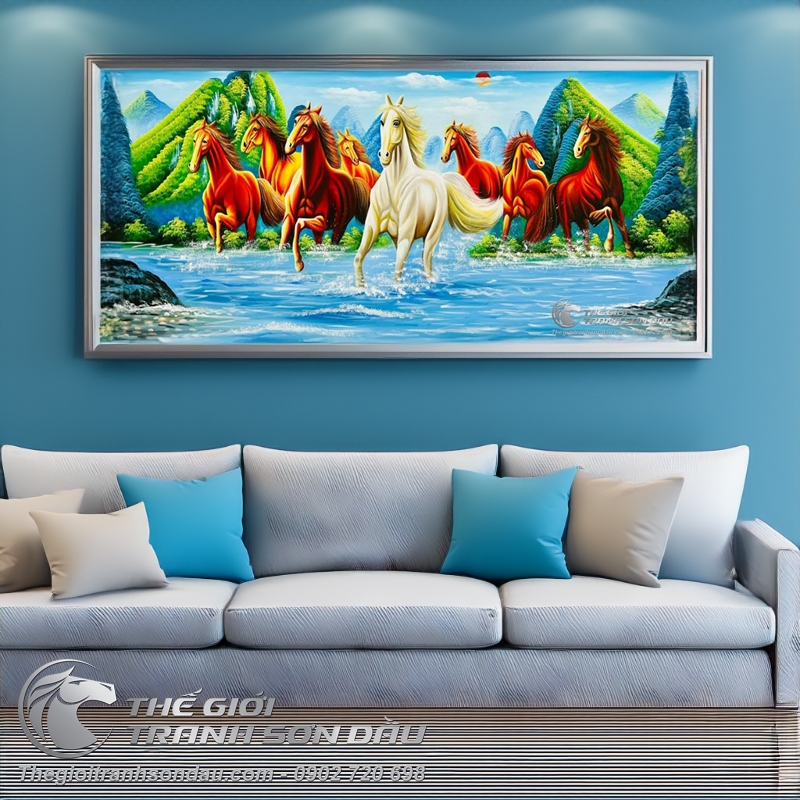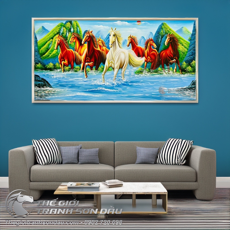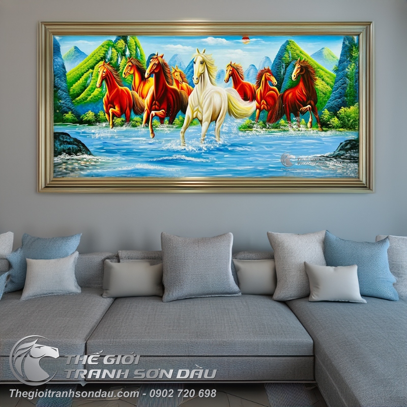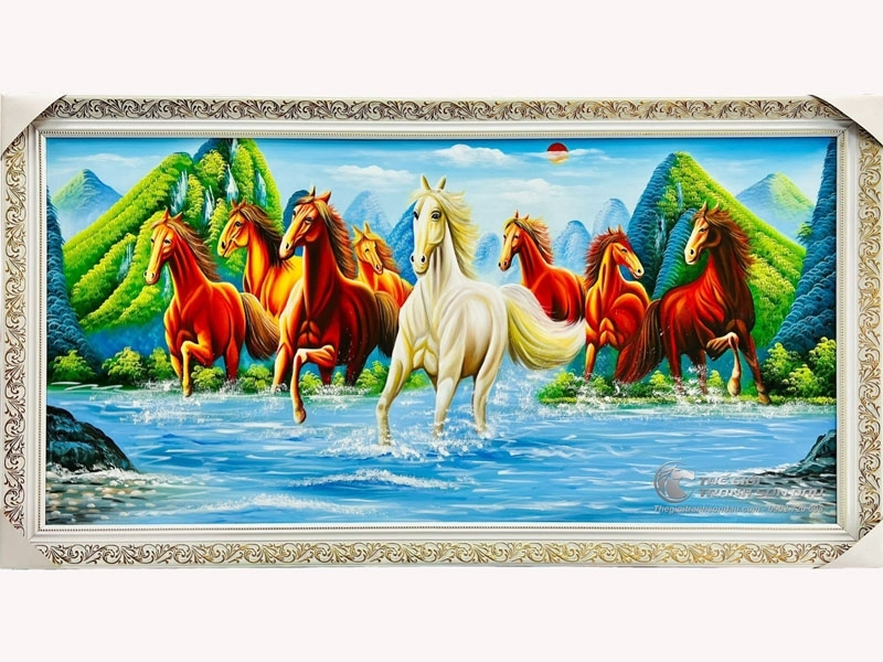 - Bức tranh mã đáo thành công sơn thủy hữu tình là một bức tranh nghệ thuật đầy màu sắc thể hiện sự tự do và sức mạnh của đàn ngựa khi chúng đang phi nước đại qua cảnh quan thiên nhiên hùng vĩ của núi rừng. Nhìn ngắm bức tranh bạn sẽ nhìn thấy một khung cảnh núi rừng bao la và ngoạn mục với cảnh núi rừng đang bừng sáng trong ánh nắng mặt trời, tạo nên một cảm giác ấm áp và thân thiện.
