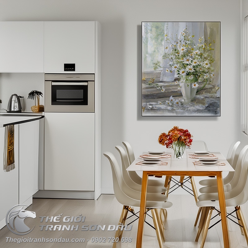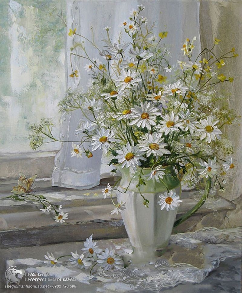Tranh Sơn Dầu Bình Hoa Cúc Trắng Đẹp Tao Nhã
