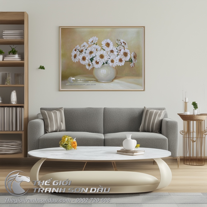 Tranh Vẽ Sơn Dầu Bình Hoa Cúc Trắng Nghệ Thuật