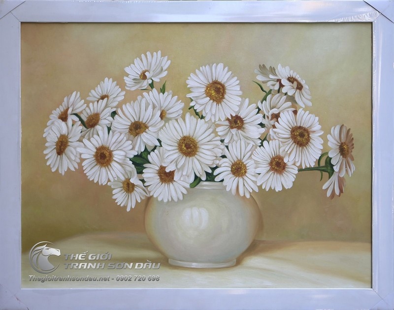 Tranh Sơn Dầu Bình Hoa Cúc Trắng Tả Thực