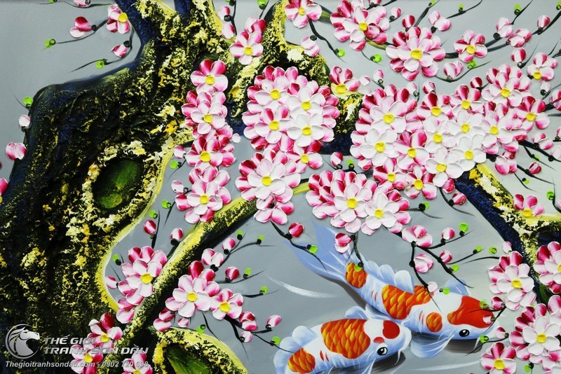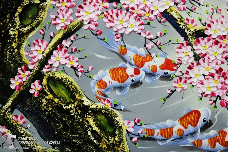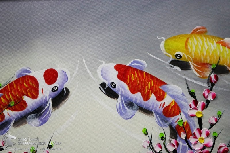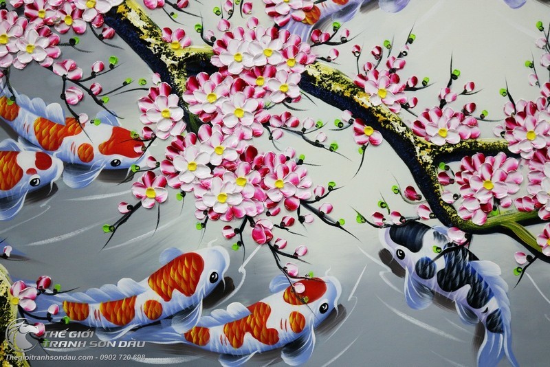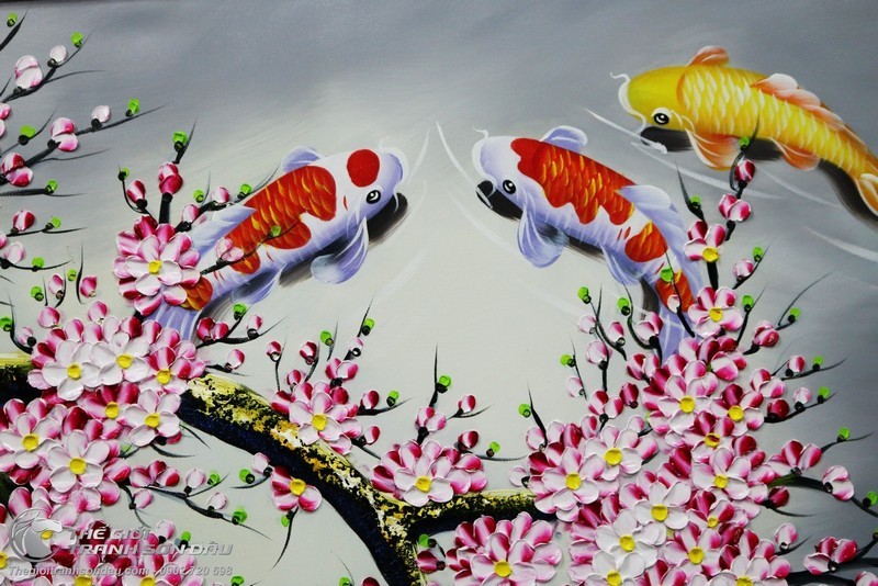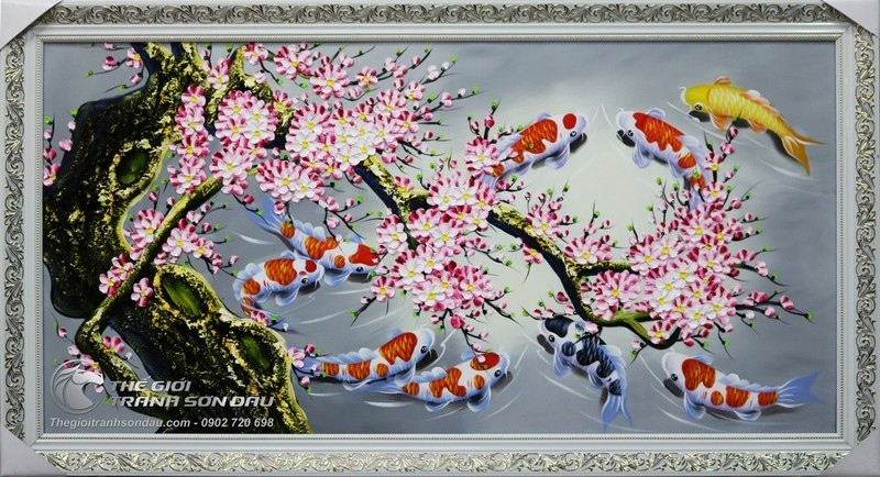 Tranh Sơn Dầu Vẽ Chín Con Cá Chép Dưới Gốc Mai Vàng