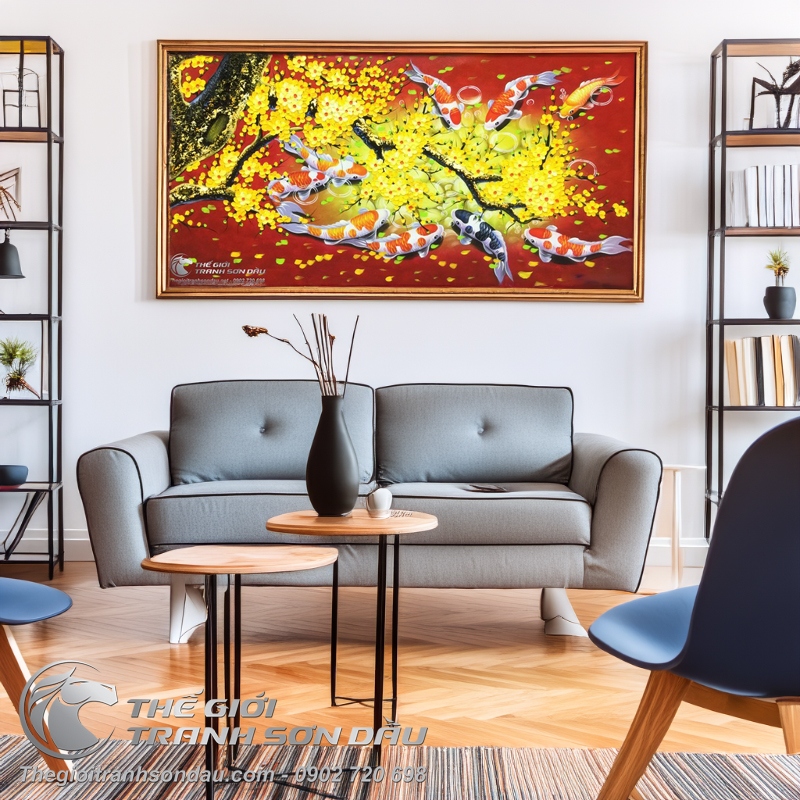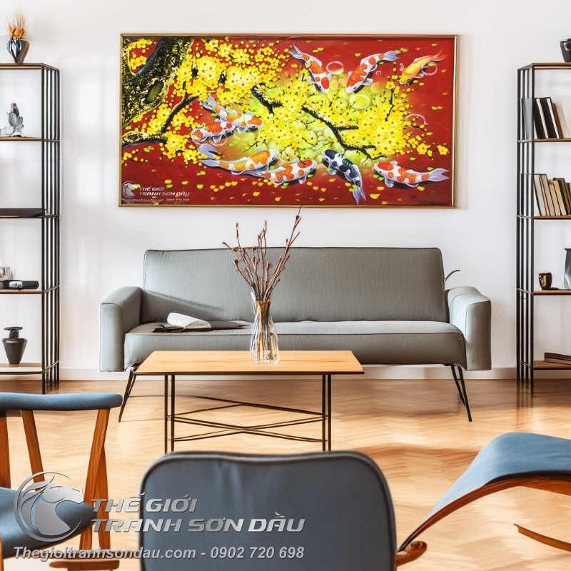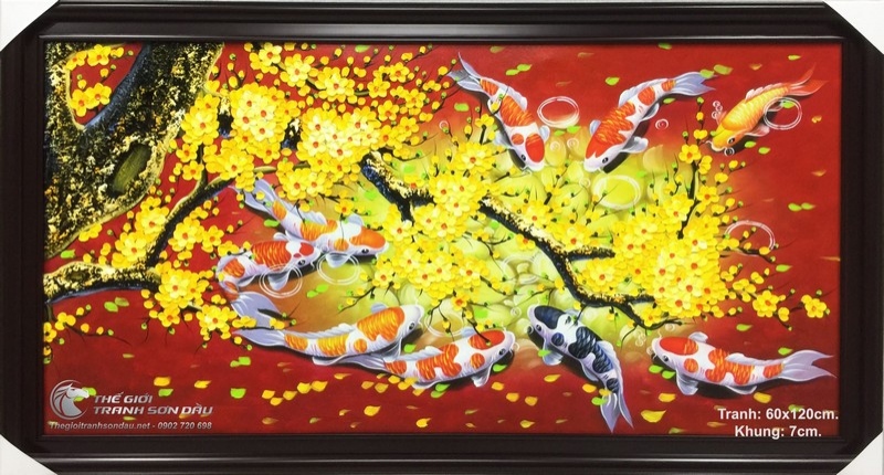 Tranh Sơn Dầu Vẽ Chín Con Cá Chép Dưới Gốc Mai Vàng