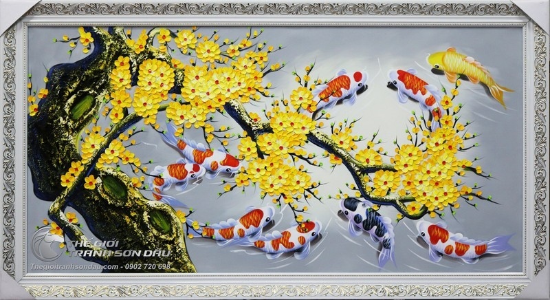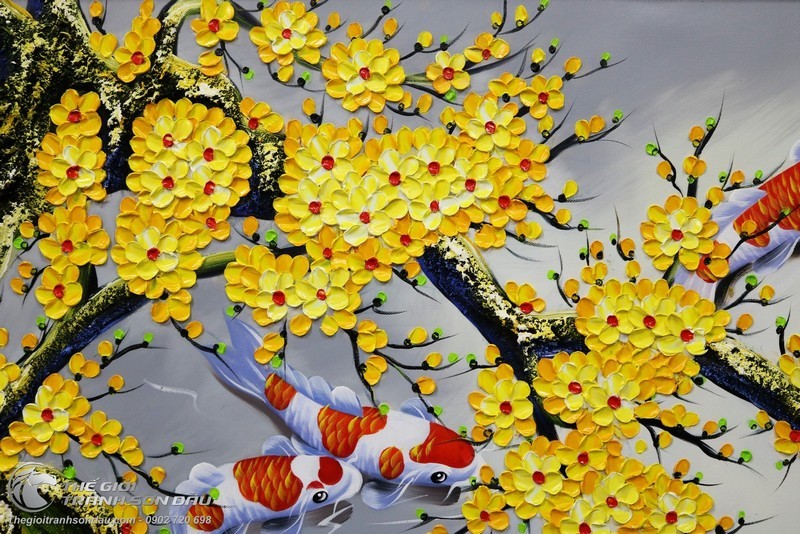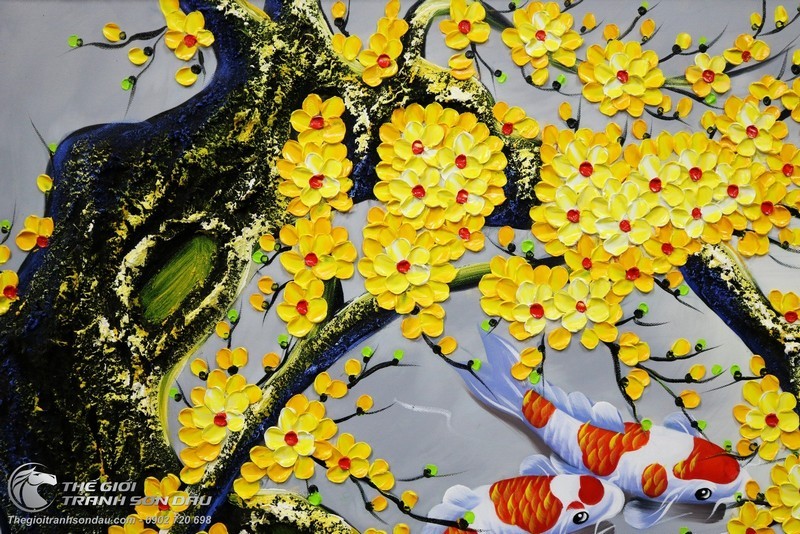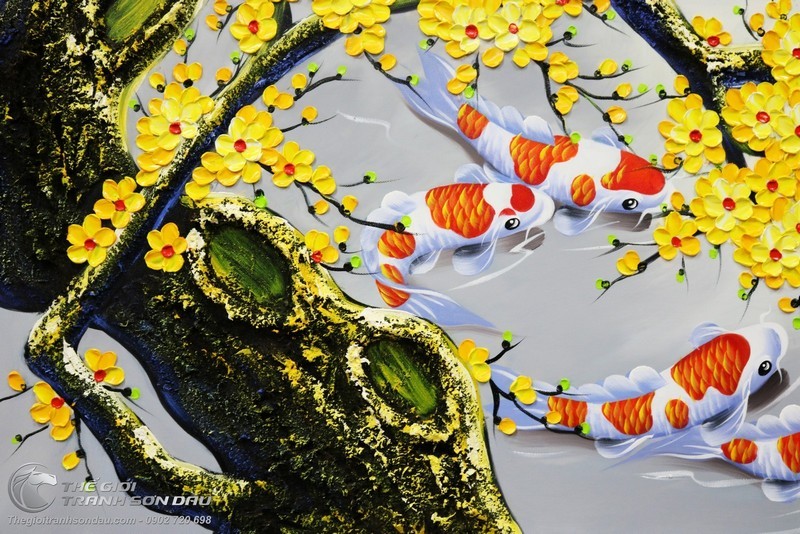- Ngày nay theo quan niệm của nhiều người, hoa mai nở càng có nhiều cánh thì càng đẹp, càng giàu có, màu vàng tượng trưng cho sự phú quý, sung túc và đủ đầy. Đặc biệt, điểm chấm phá khác lạ trong bức họa này là dưới bóng mai vàng khoe sắc, một đàn cá chép Koi nhiều màu sắc đang bơi lội tung tăng. Cá chép Koi được biết đến là một loại cá có sức sống mãnh liệt, lâu dài và cũng được coi là một loài cá quý.