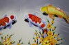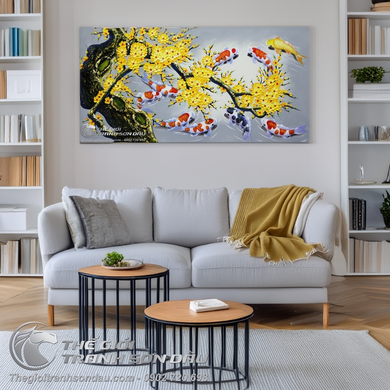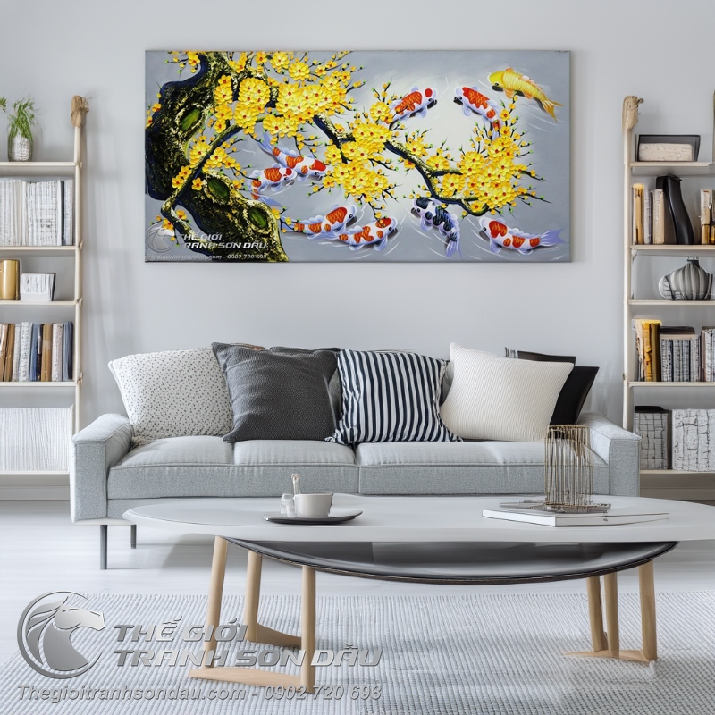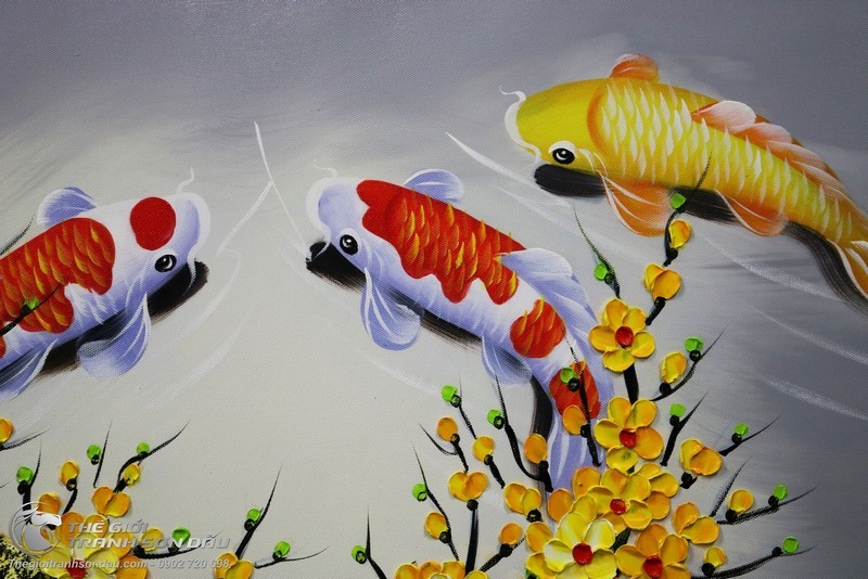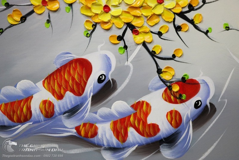 - Tranh cá chép được xem là một biểu tượng cho sự trường tồn, sức mạnh, ước vọng, lòng kiên trì và cả may mắn. Cùng với đó, 9 con cá chép còn có ý nghĩa là hữu bật phúc tinh, cũng là sao cát nên 9 con có ý nghĩa vượng tài, mang tài lộc về nhà. Trong tác phẩm này, người họa sĩ còn tinh tế trong việc sử dụng màu sắc cho cá chép Koi: màu trắng với những đốm đỏ tượng trưng cho sự thành công trong sự nghiệp, màu vàng tượng trưng cho sự giàu có, màu đen và màu trắng đại diện cho sự hòa hợp của hai nguồn năng lượng âm dương tạo ra một sự cân bằng và hài hòa.