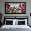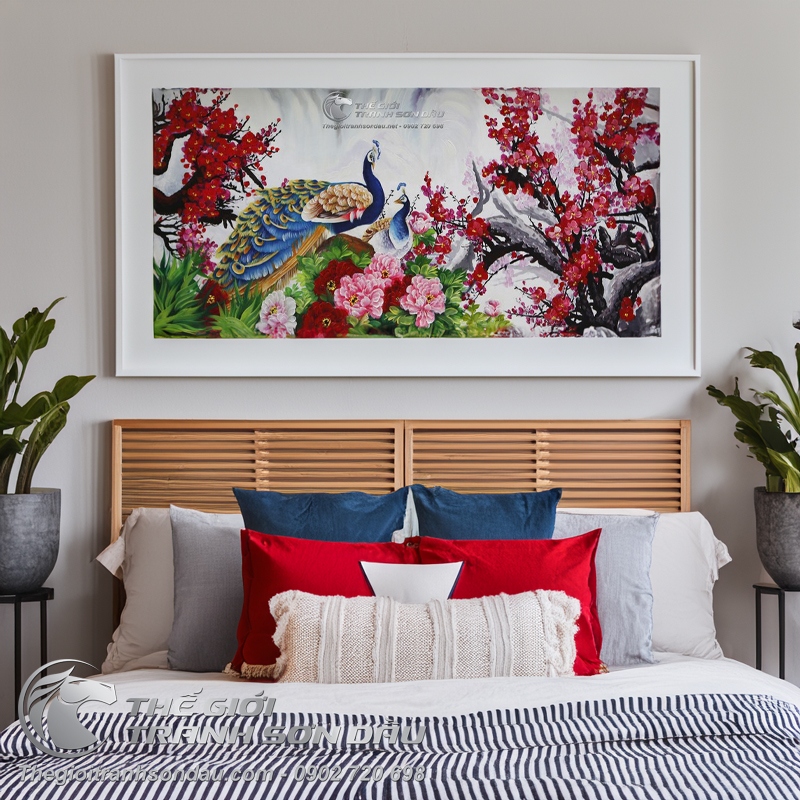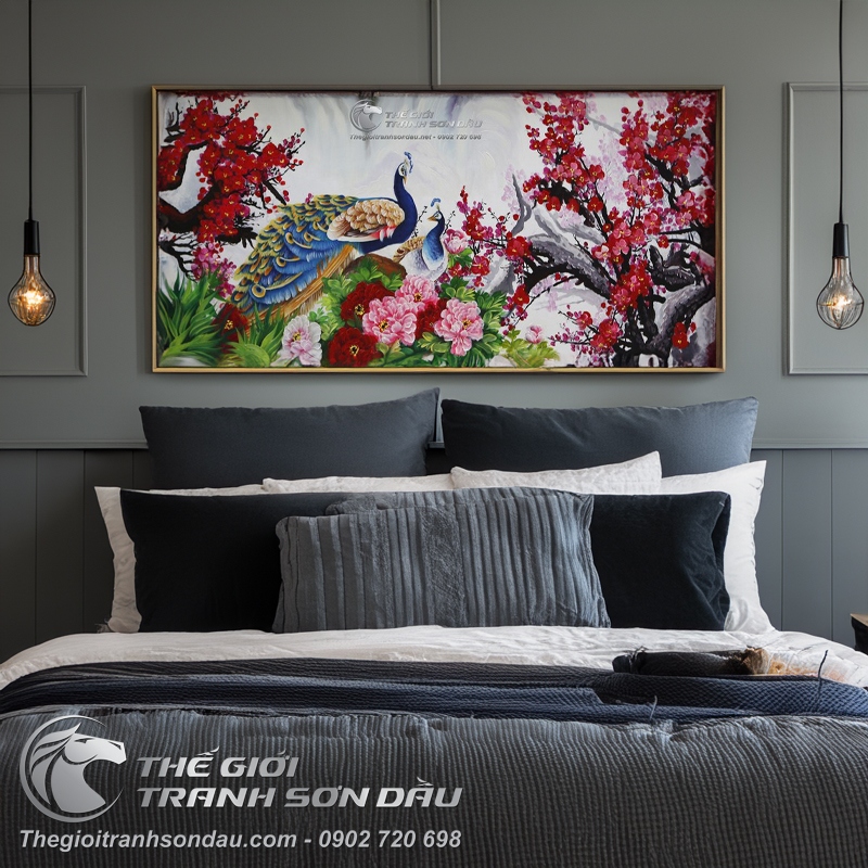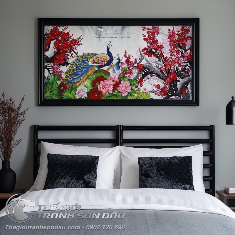 - Bức tranh cưới đôi công uyên ương đẹp được vẽ với nhiều màu sắc rực rỡ, nó thể hiện được sự cao sang, quyến rũ của loài chim quý hiếm này. Đôi chim công được vẽ cùng với những cành hoa nở đỏ rực, tươi thắm một góc trời, khiến cho ta có cảm giác như nó đang hưởng thụ một cuộc sống hạnh phúc, vẹn tròn.