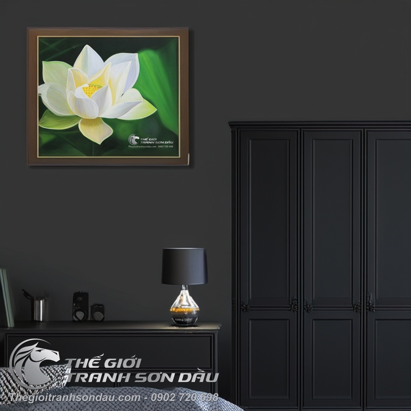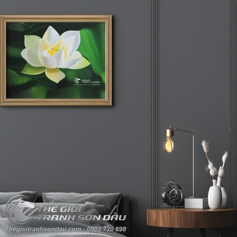 Tranh Sơn Dầu Hoa Sen Trắng Tả Thực