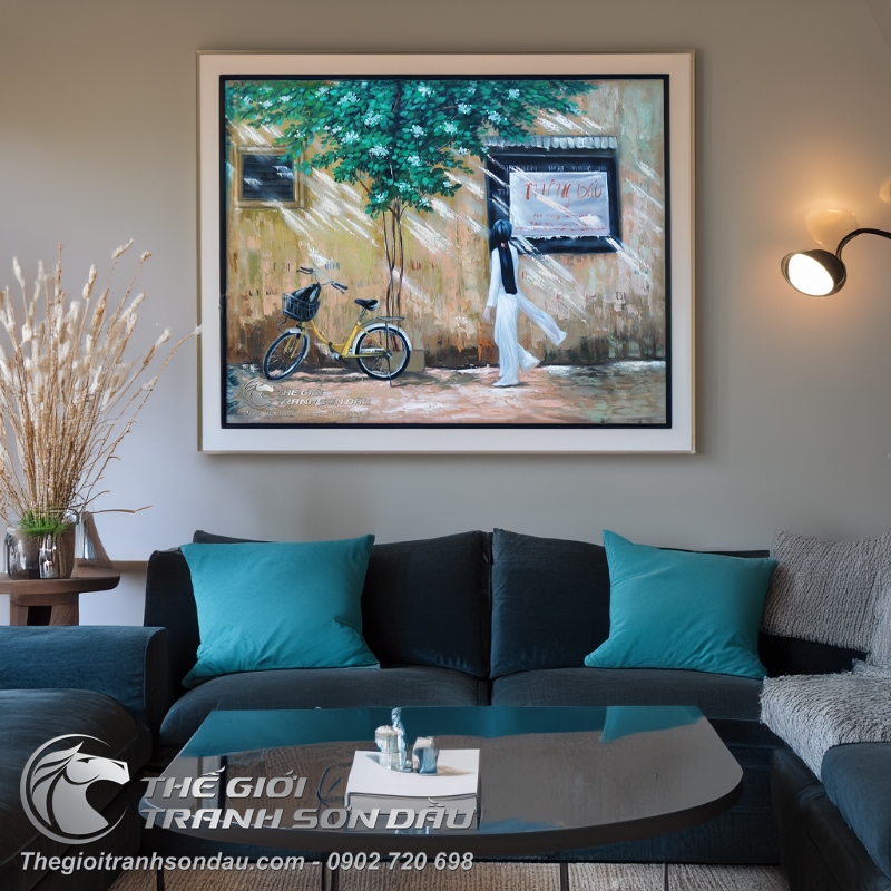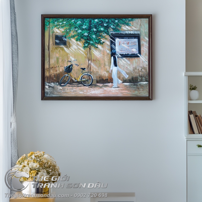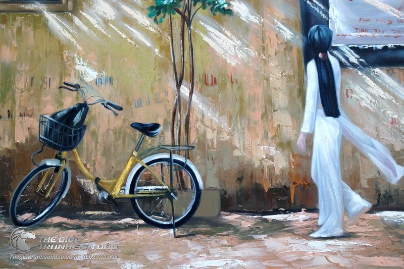 Tranh Sơn Dầu Nghệ Thuật Nữ Sinh Dắt Xe Đạp