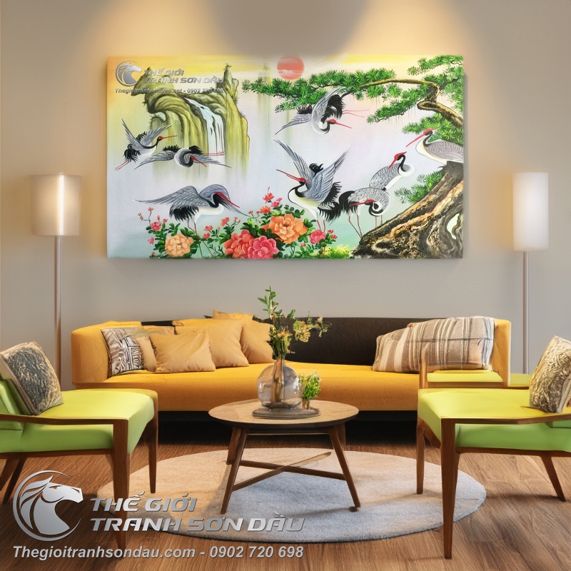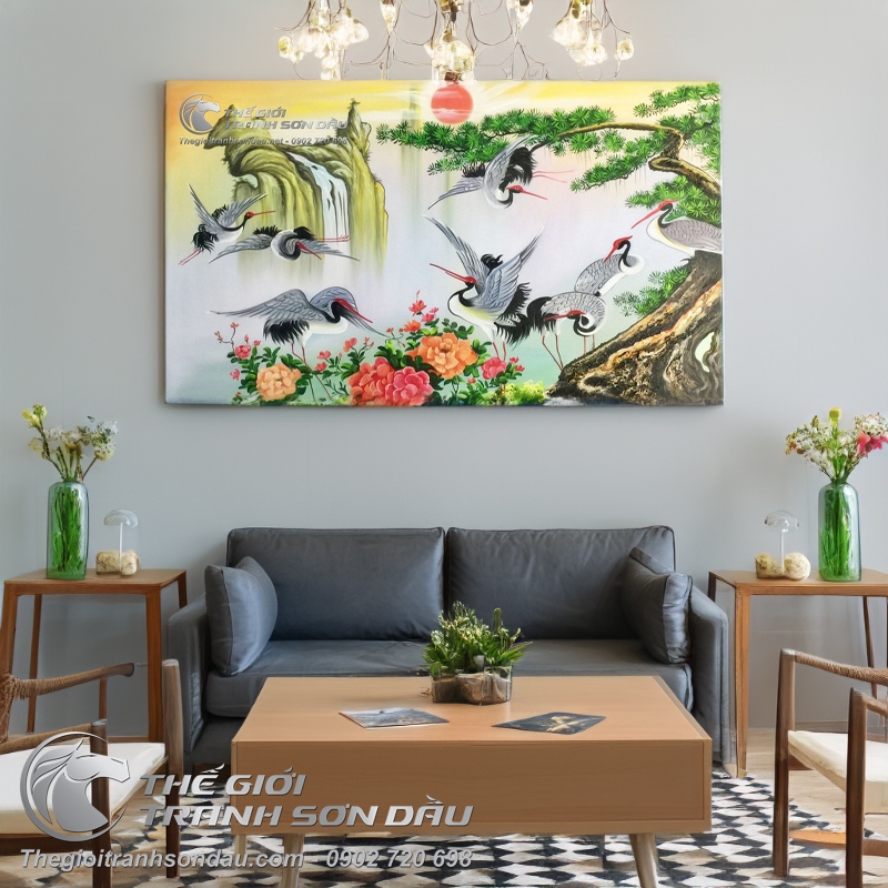 Tranh Sơn Dầu Phong Thủy Cây Tùng và Tám Con Hạc