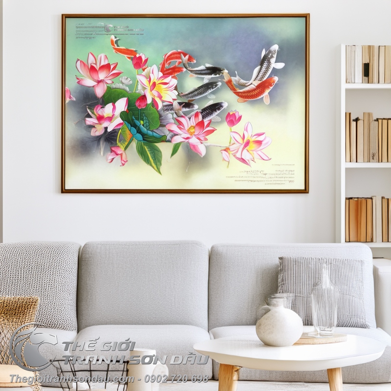 Tranh Sơn Dầu Phong Thủy Cửu Ngư và Hoa Sen