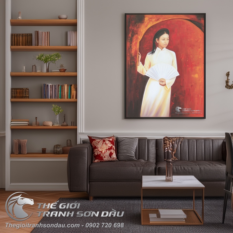 Tranh Sơn Dầu Thiếu Nữ Áo Dài Cầm Quạt