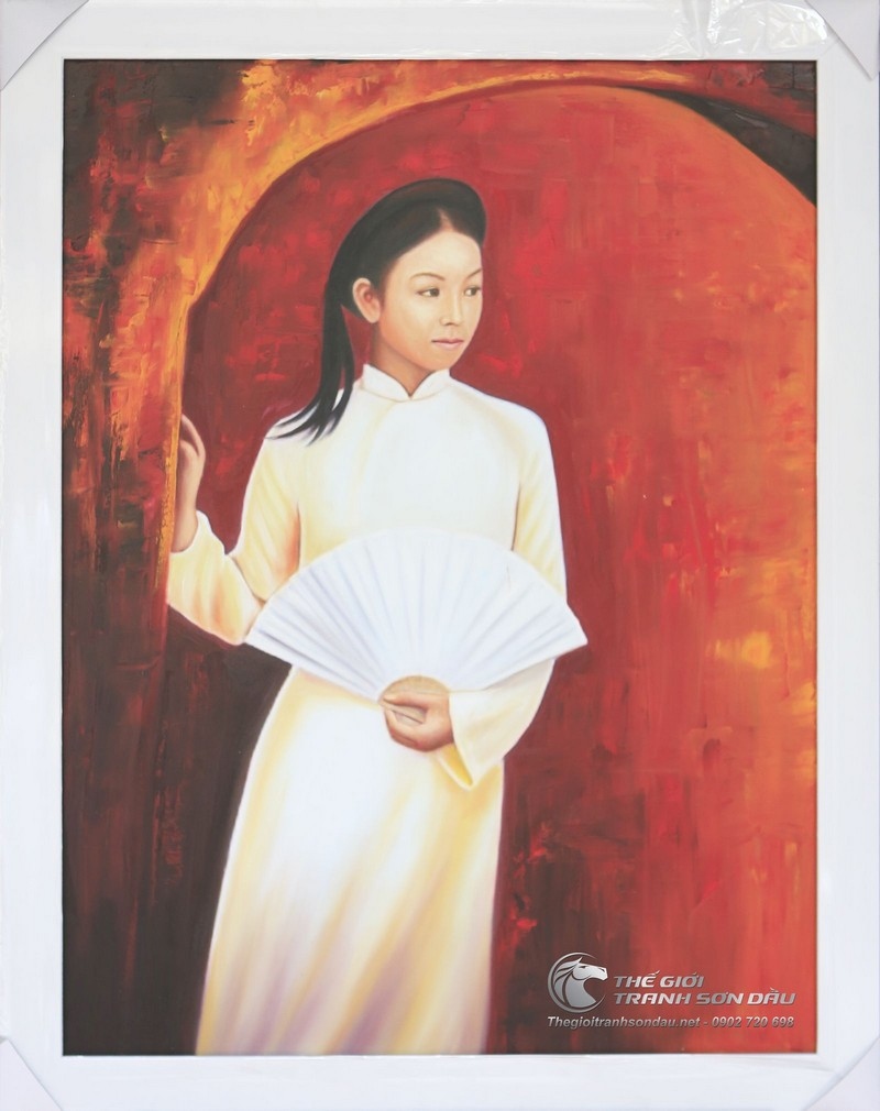 Tranh Sơn Dầu Thiếu Nữ Áo Dài Cầm Quạt Đẹp Giá Rẻ 30%