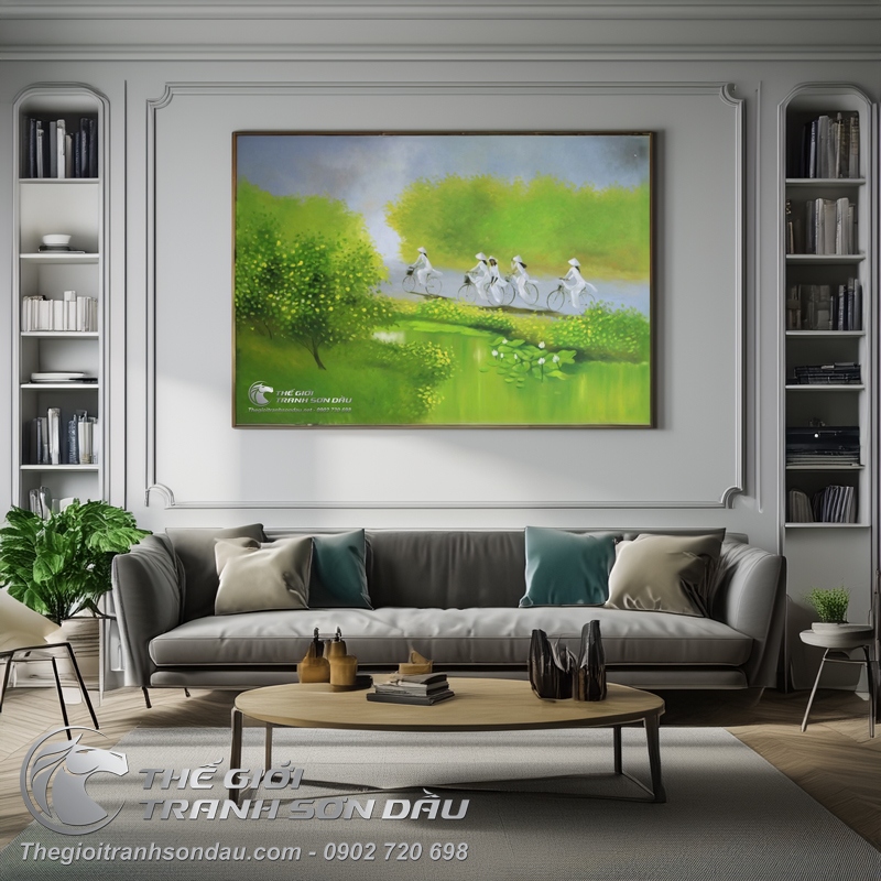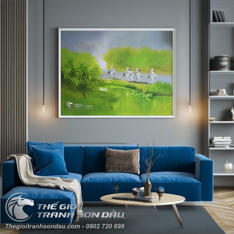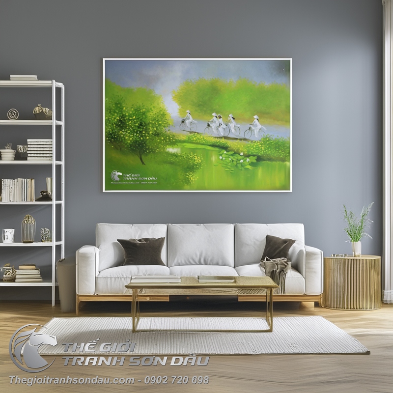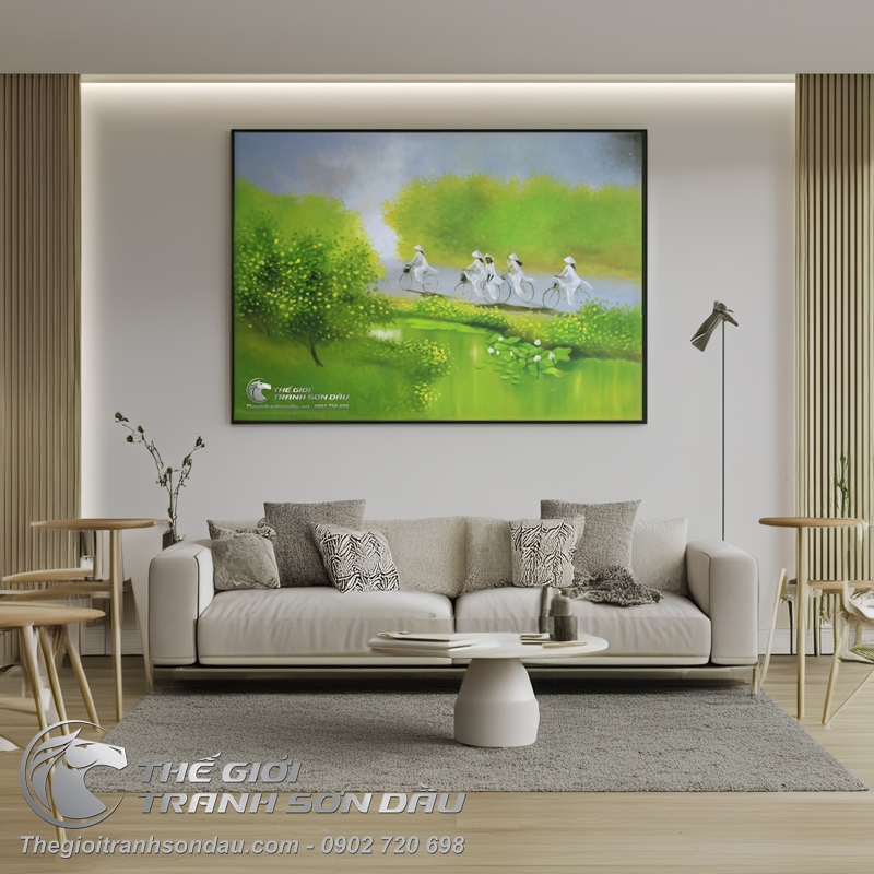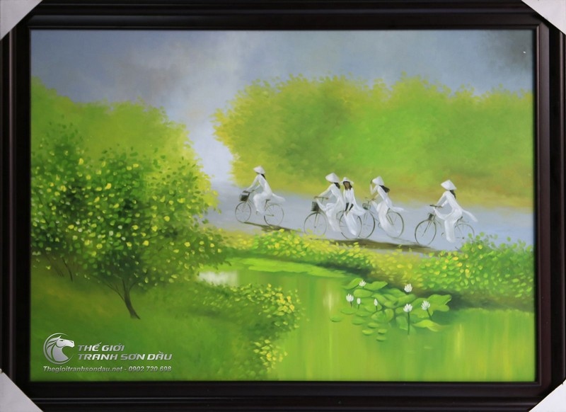 Tranh Sơn Dầu Thiếu Nữ Việt Nam Mặc Áo Dài Chạy Xe Đạp