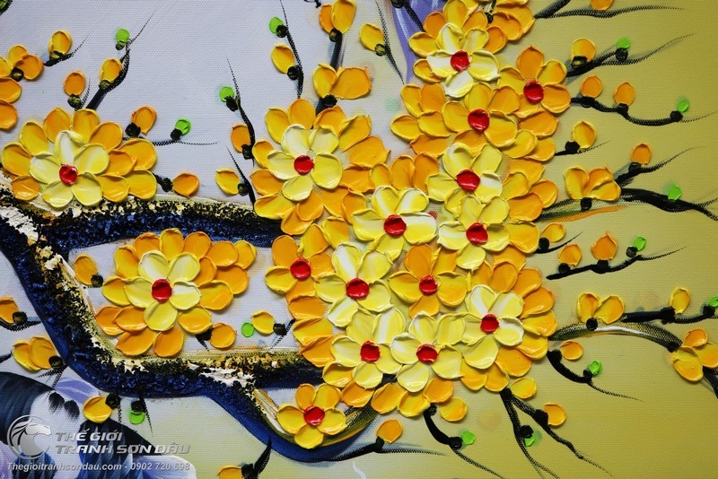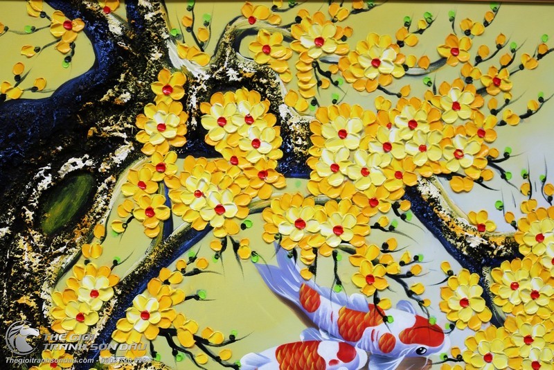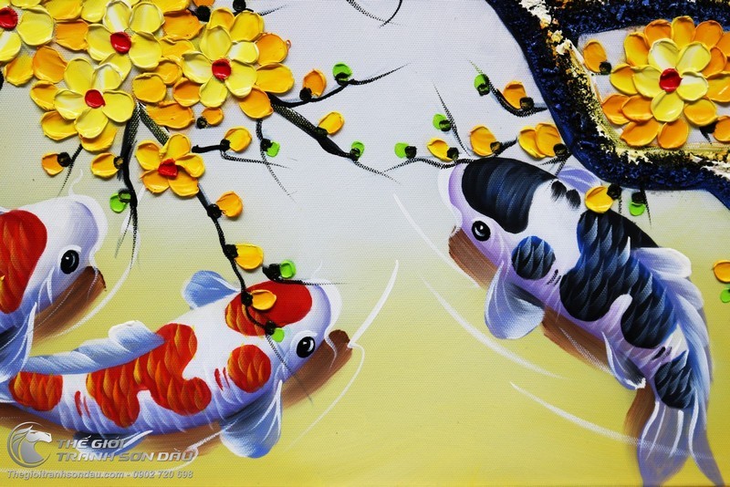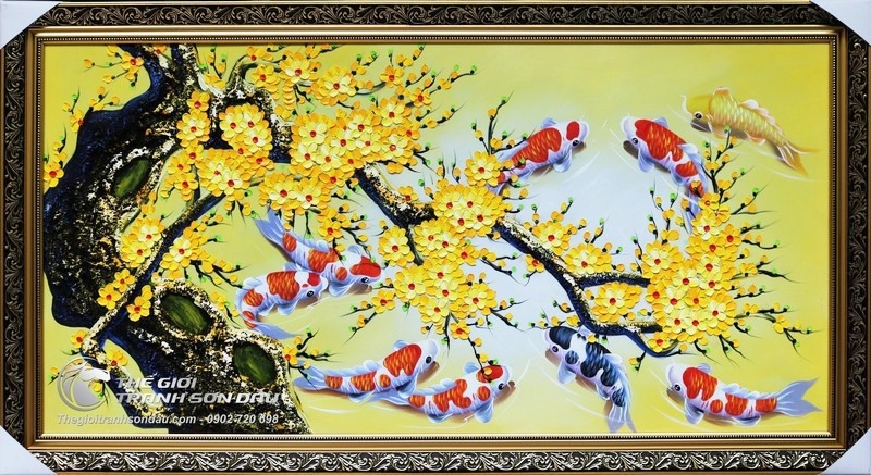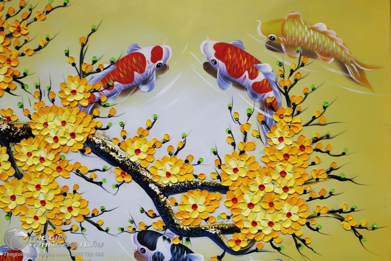 - Tranh vẽ sơn dầu treo tường cá chép chín con sử dụng phương pháp vẽ đắp bay với từng mảng màu được đắp từng lớp từng lớp lại với nhau để tạo độ chân thực cao nhất. Khách hàng có thể sờ trực tiếp nên mặt tranh để cảm nhận những nét xù xì của thời gian trên thân cây mai già, những càng mai đung đưa trong gió xuân. Đây là sự khác biệt hoàn toàn so với loại tranh vẽ trên bề mặt giấy thông thường.