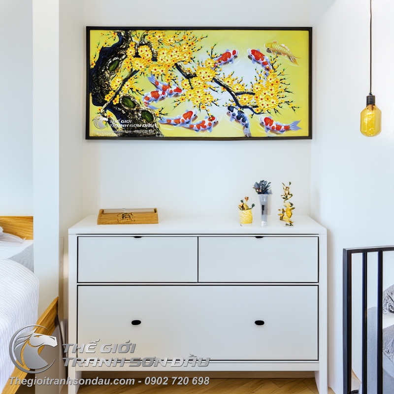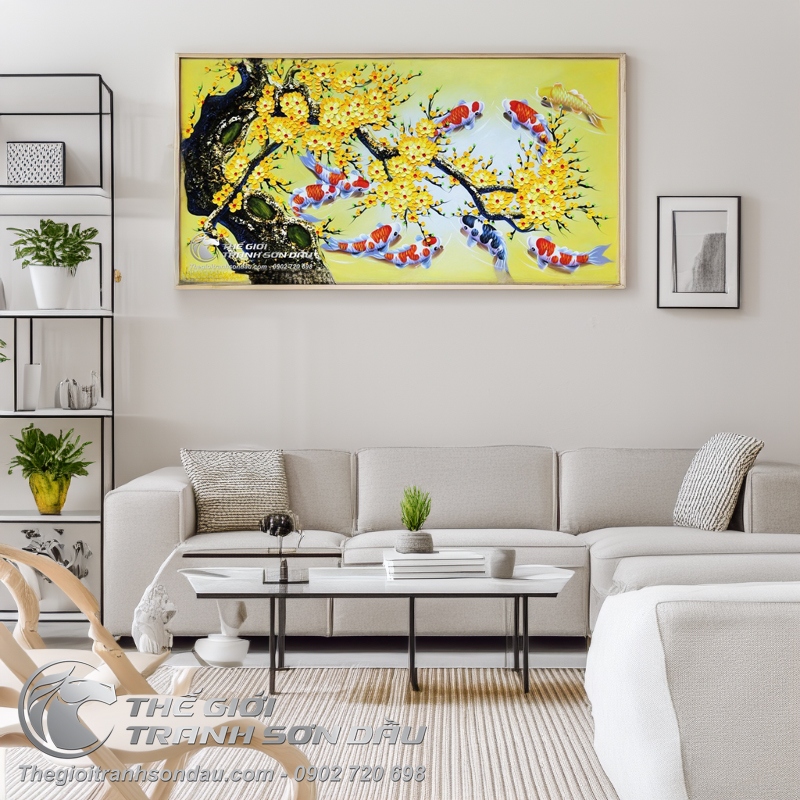 - Tranh vẽ cá chép chín con dưới gốc mai vàng là sự kết hợp giữa hai hình ảnh tượng trưng cho sức sống & sự khởi đầu mới trong văn hóa Á Đông. Sản phẩm là sự lựa chọn lý tưởng để trang trí trong phòng khách gia đình & văn phòng làm việc để thúc đẩy sự phát triển trong công việc, mang lại sự tươi mới cho không gian.