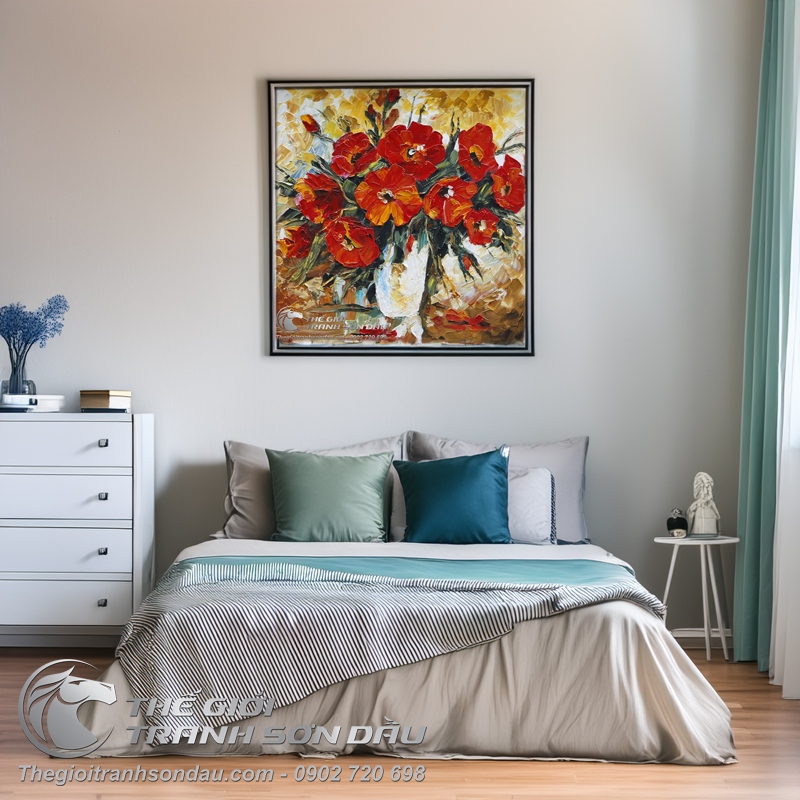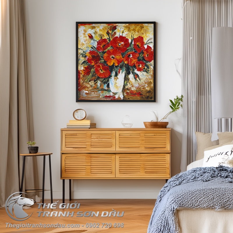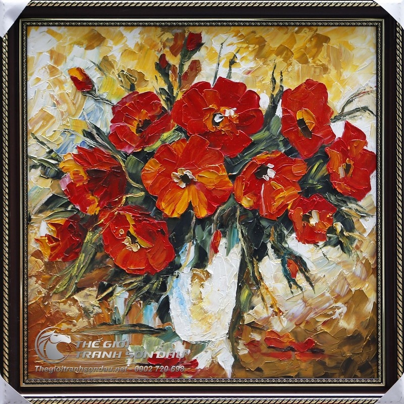 Tranh Sơn Dầu Vẽ Dày Màu Hoa Đỏ Đẹp
