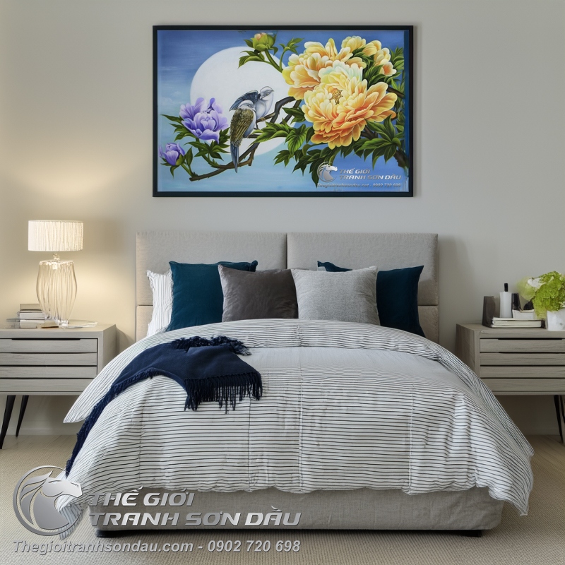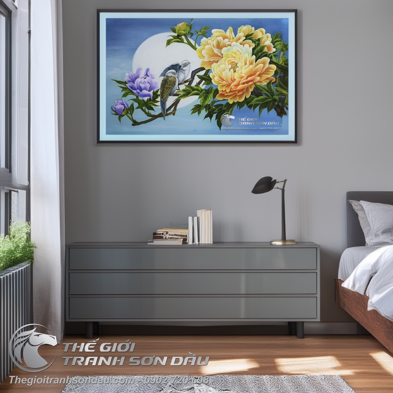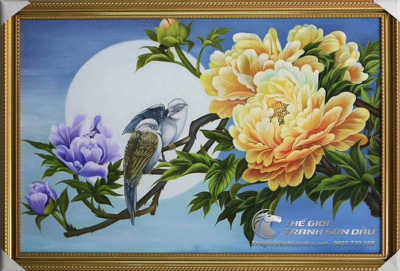 Tranh Sơn Dầu Vẽ Đôi Chim Và Hoa Mẫu Đơn Vàng