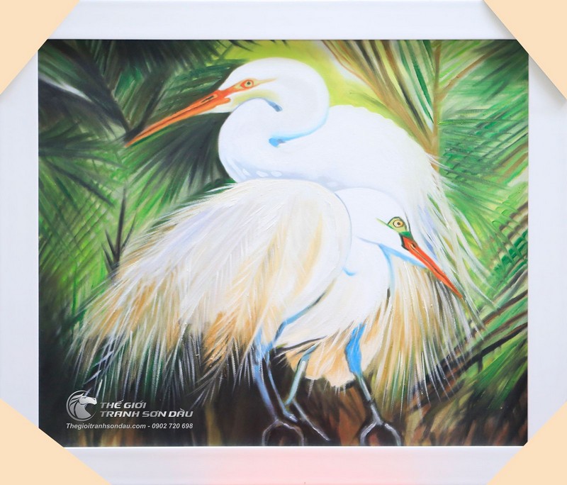 - Tác phẩm tranh sơn dầu vẽ đôi cò bên nhau còn được trang bị khung tranh với chất lượng cao, nó có thể chống cong vênh và mối mọt, nhờ độ rắn chắc và cứng cỏi mà nó bảo vệ được hình ảnh bền bỉ theo thời gian, theo năm tháng.