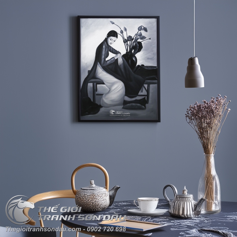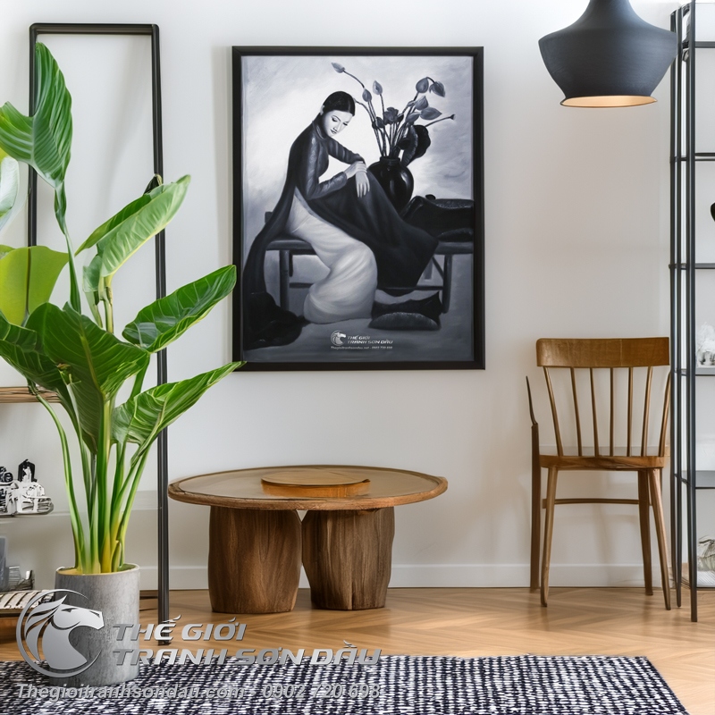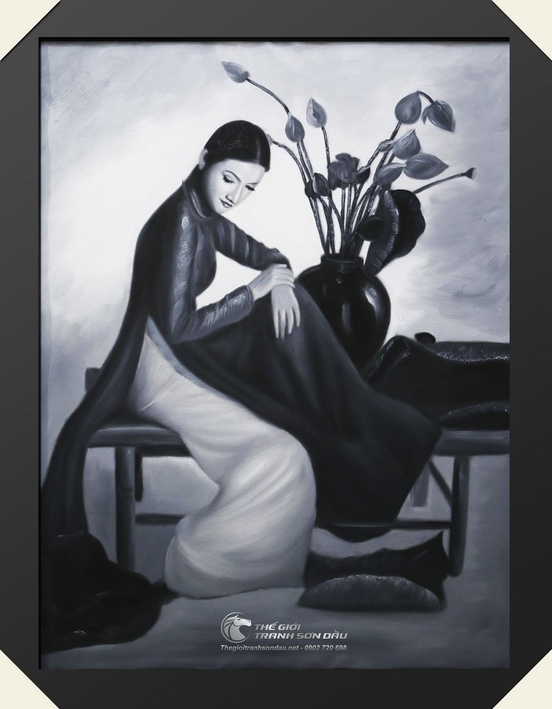 Tranh Sơn Dầu Thiếu Nữ Việt Nam Mặc Áo Dài Trắng Đen Cổ Điển